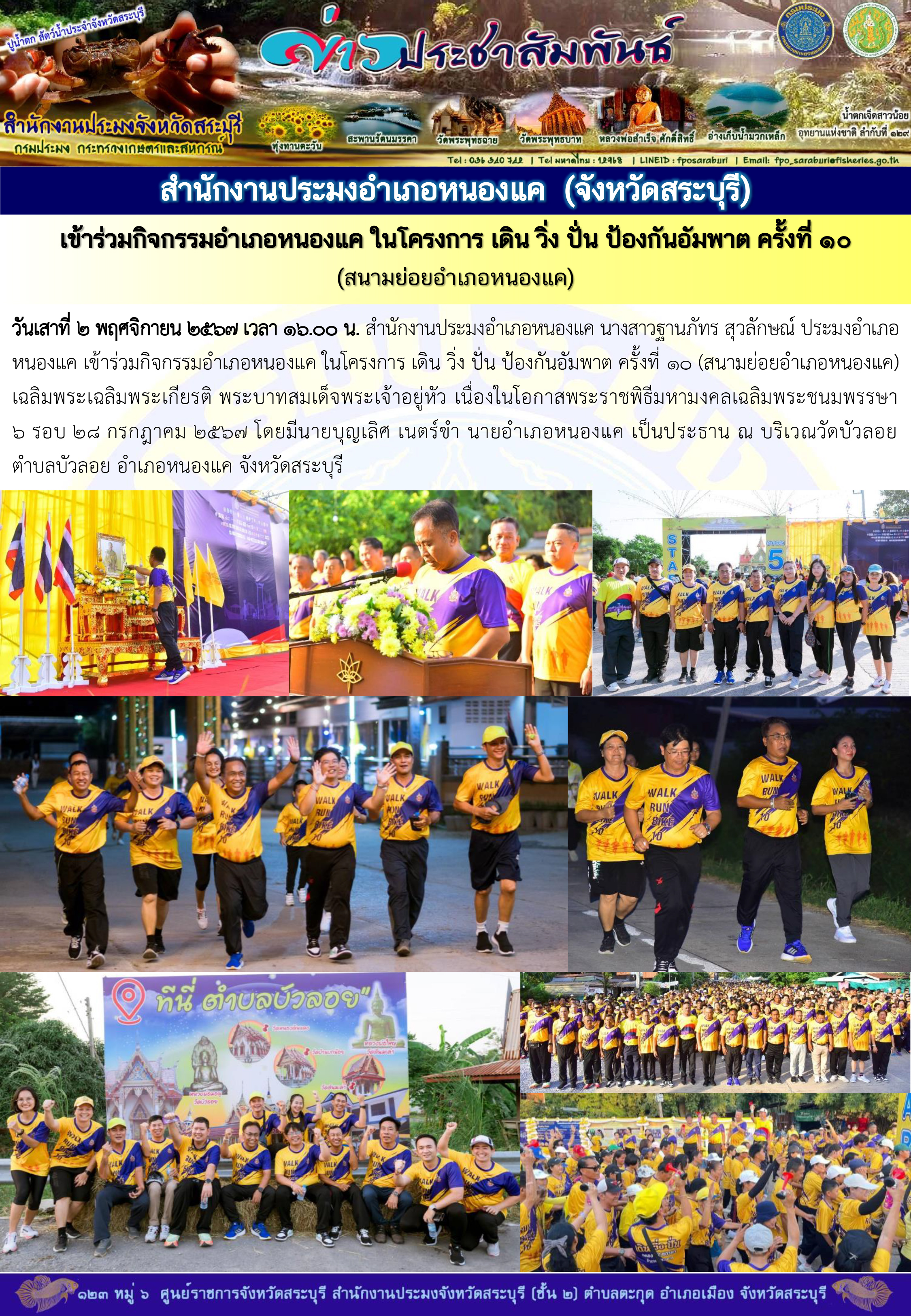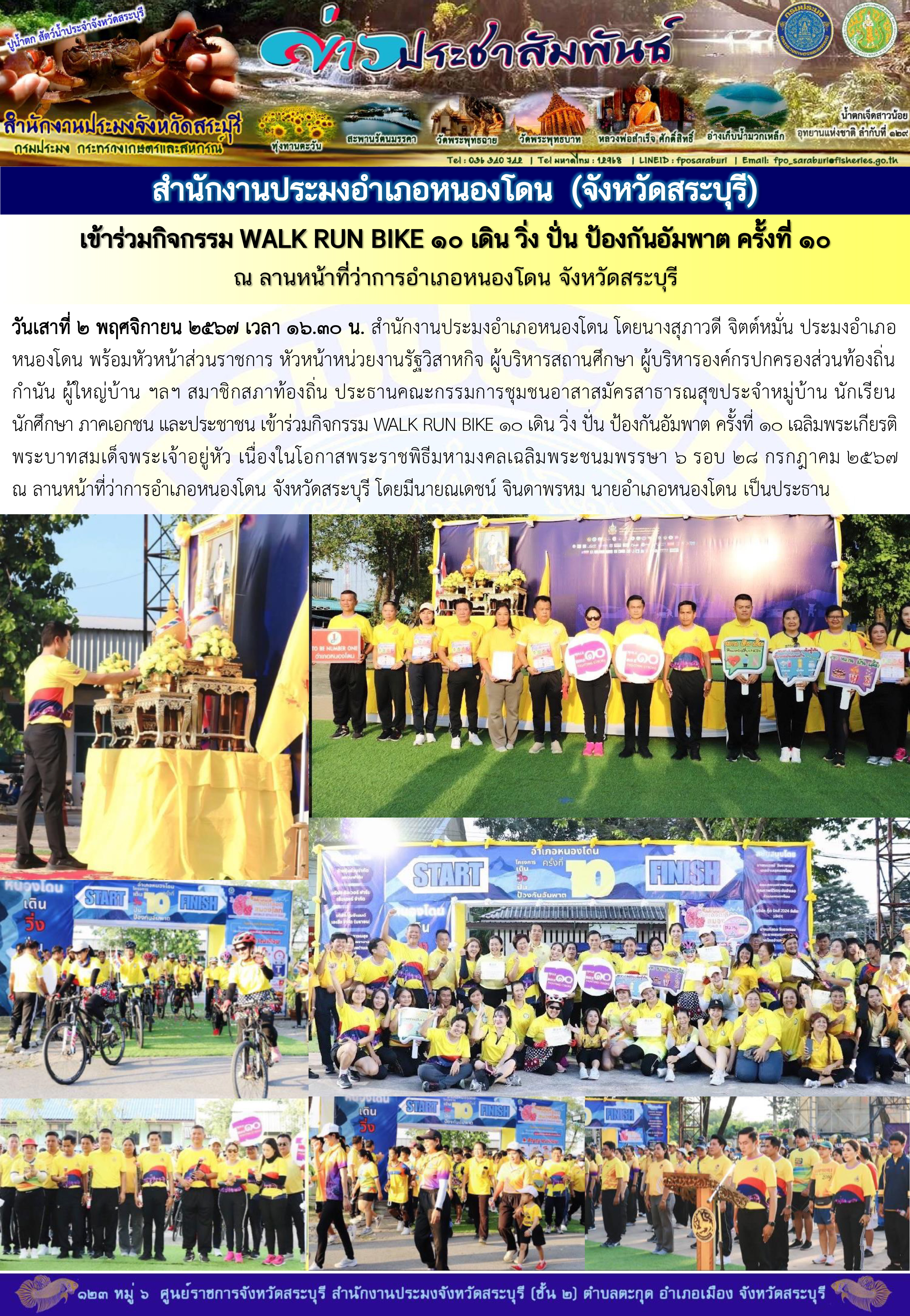 สำนักงานประมงอำเภอหนองโดน เข้าร่วมกิจกรรม WALK RUN BIKE 10 เดิน วิ่ง ปั่น ป้องกันอัมพาต ครั้งที่ 10 ณ ลานหน้าที่ว่าการอำเภอหนองโดน จังหวัดสระบุรี