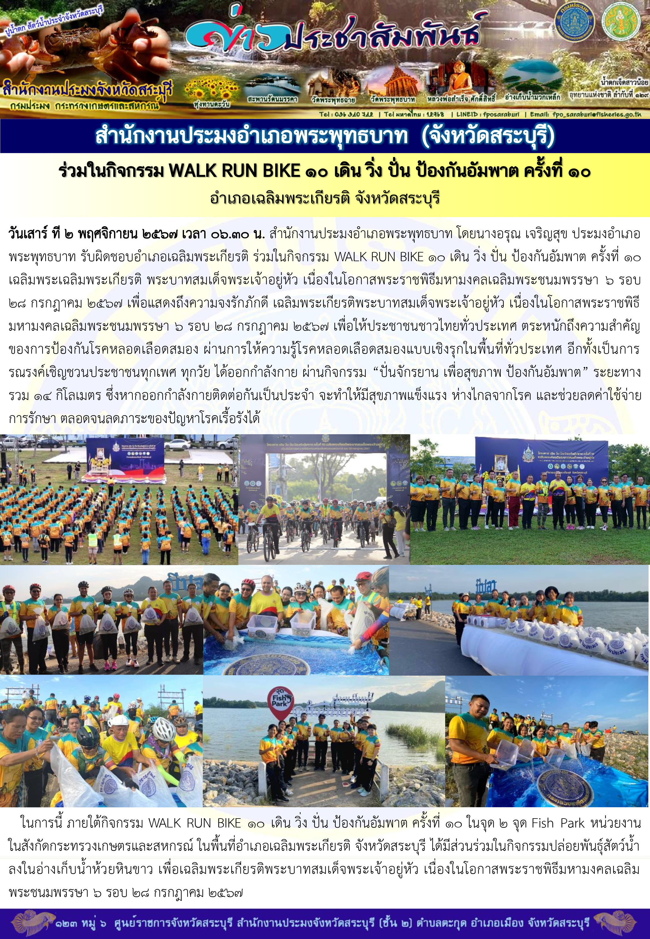 วันเสาร์ ที 2 พฤศจิกายน 2567 เวลา 06.30 น. สำนักงานประมงอำเภอพระพุทธบาท โดยนางอรุณ เจริญสุข ประมงอำเภอพระพุทธบาท รับผิดชอบอำเภอเฉลิมพระเกียรติ ร่วมในกิจกรรม WALK RUN BIKE 10 เดิน วิ่ง ปั่น ป้องกันอัมพาต ครั้งที่ 10 เฉลิมพระเฉลิมพระเกียรติ พระบาทสมเด็จพระเจ้าอยู่หัว เนื่องในโอกาสพระราชพิธีมหามงคลเฉลิมพระชนมพรรษา 6 รอบ 28 กรกฎาคม 2567 เพื่อแสดงถึงความจงรักภักดี เฉลิมพระเกียรติพระบาทสมเด็จพระเจ้าอยู่หัว เนื่องในโอกาสพระราชพิธีมหามงคลเฉลิมพระชนมพรรษา 6 รอบ 28 กรกฎาคม 2567 เพื่อให้ประชาชนชาวไทยทั่วประเทศ ตระหนักถึงความสำคัญของการป้องกันโรคหลอดเลือดสมอง ผ่านการให้ความรู้โรคหลอดเลือดสมองแบบเชิงรุกในพื้นที่ทั่วประเทศ อีกทั้งเป็นการรณรงค์เชิญชวนประชาชนทุกเพศ ทุกวัย ได้ออกกำลังกาย ผ่านกิจกรรม “ปั่นจักรยาน เพื่อสุขภาพ ป้องกันอัมพาต” ระยะทางรวม 14 กิโลเมตร ซึ่งหากออกกำลังกายติดต่อกันเป็นประจำ จะทำให้มีสุขภาพแข็งแรง ห่างไกลจากโรค และช่วยลดค่าใช้จ่ายการรักษา ตลอดจนลดภาระของปัญหาโรคเรื้อรังได้