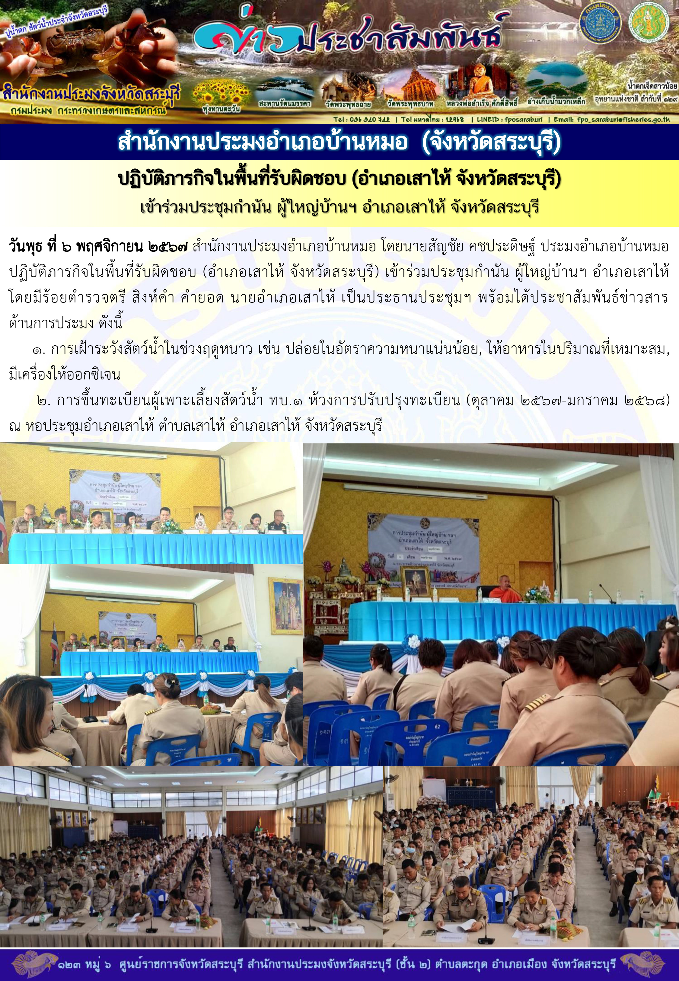 สำนักงานประมงอำเภอบ้านหมอ ปฏิบัติภารกิจในพื้นที่รับผิดชอบ (อำเภอเสาไห้ จังหวัดสระบุรี) เข้าร่วมประชุมกำนัน ผู้ใหญ่บ้านฯ อำเภอเสาไห้ จังหวัดสระบุรี