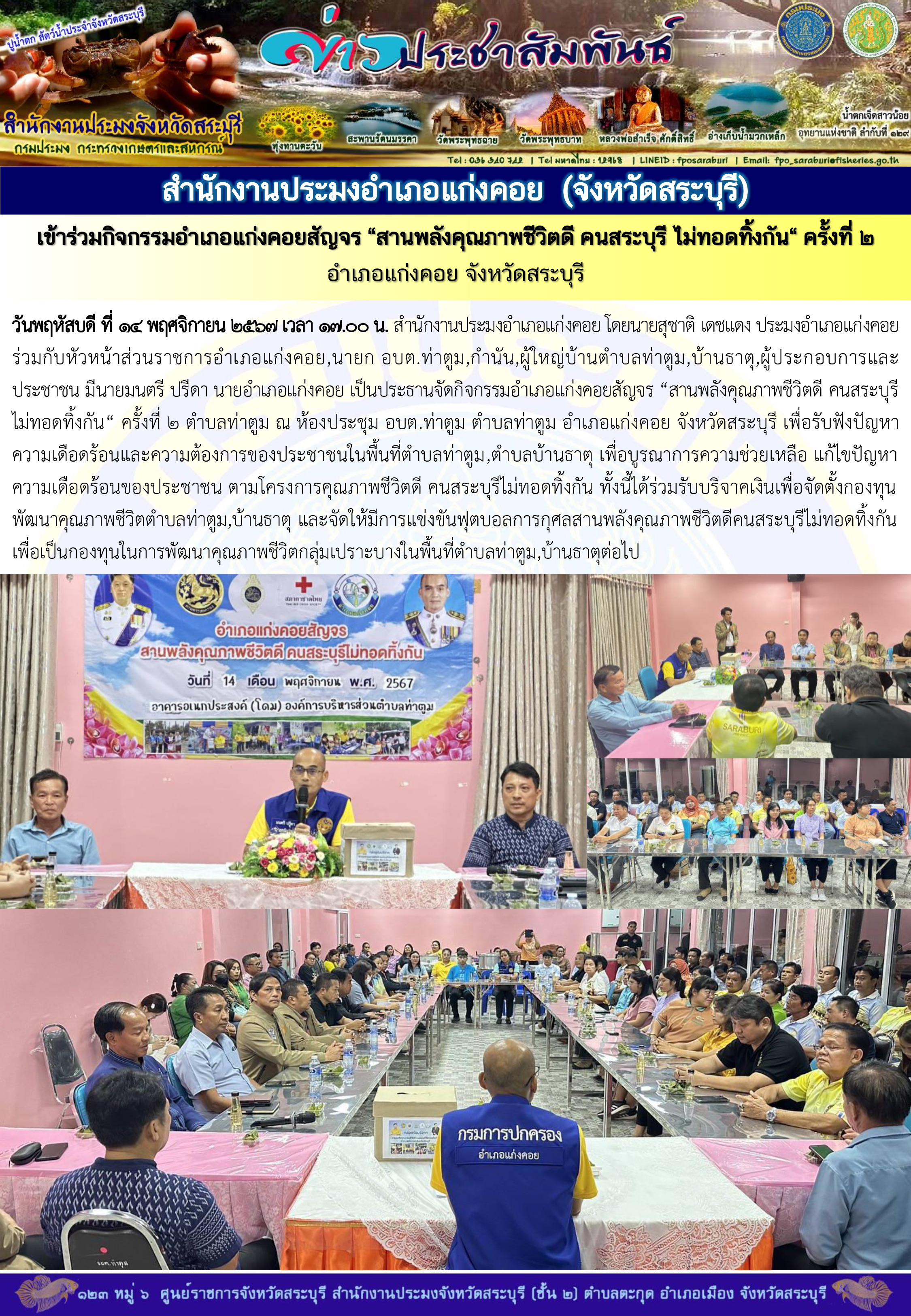 วันพฤหัสบดี ที่ 14 พฤศจิกายน 2567 เวลา 17.00 น. สำนักงานประมงอำเภอแก่งคอย โดยนายสุชาติ เดชแดง ประมงอำเภอแก่งคอย ร่วมกับหัวหน้าส่วนราชการอำเภอแก่งคอย,นายก อบต.ท่าตูม,กำนัน,ผู้ใหญ่บ้านตำบลท่าตูม,บ้านธาตุ,ผู้ประกอบการและประชาชน มีนายมนตรี ปรีดา นายอำเภอแก่งคอย เป็นประธานจัดกิจกรรมอำเภอแก่งคอยสัญจร “สานพลังคุณภาพชีวิตดี คนสระบุรี ไม่ทอดทิ้งกัน“ ครั้งที่ 2 ตำบลท่าตูม ณ ห้องประชุม อบต.ท่าตูม ตำบลท่าตูม อำเภอแก่งคอย จังหวัดสระบุรี เพื่อรับฟังปัญหาความเดือดร้อนและความต้องการของประชาชนในพื้นที่ตำบลท่าตูม,ตำบลบ้านธาตุ เพื่อบูรณาการความช่วยเหลือ แก้ไขปัญหาความเดือดร้อนของประชาชน ตามโครงการคุณภาพชีวิตดี คนสระบุรีไม่ทอดทิ้งกัน ทั้งนี้ได้ร่วมรับบริจาคเงินเพื่อจัดตั้งกองทุนพัฒนาคุณภาพชีวิตตำบลท่าตูม,บ้านธาตุ และจัดให้มีการแข่งขันฟุตบอลการกุศลสานพลังคุณภาพชีวิตดีคนสระบุรีไม่ทอดทิ้งกัน เพื่อเป็นกองทุนในการพัฒนาคุณภาพชีวิตกลุ่มเปราะบางในพื้นที่ตำบลท่าตูม,บ้านธาตุต่อไป