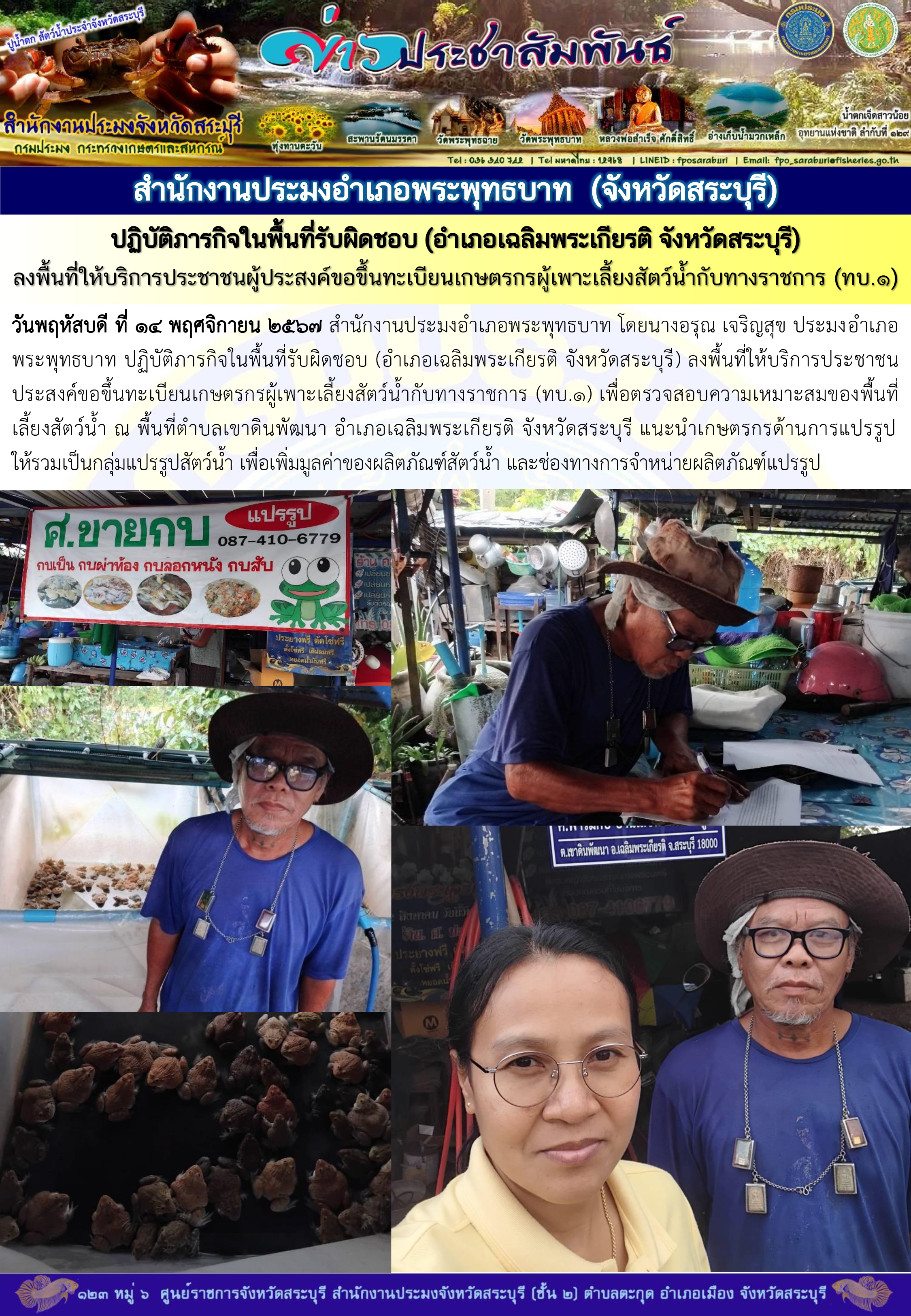 สำนักงานประมงอำเภอพระพุทธบาท ปฏิบัติภารกิจในพื้นที่รับผิดชอบ (อำเภอเฉลิมพระเกียรติ จังหวัดสระบุรี) ลงพื้นที่ให้บริการประชาชนผู้ประสงค์ขอขึ้นทะเบียนเกษตรกรผู้เพาะเลี้ยงสัตว์น้ำกับทางราชการ (ทบ.1)