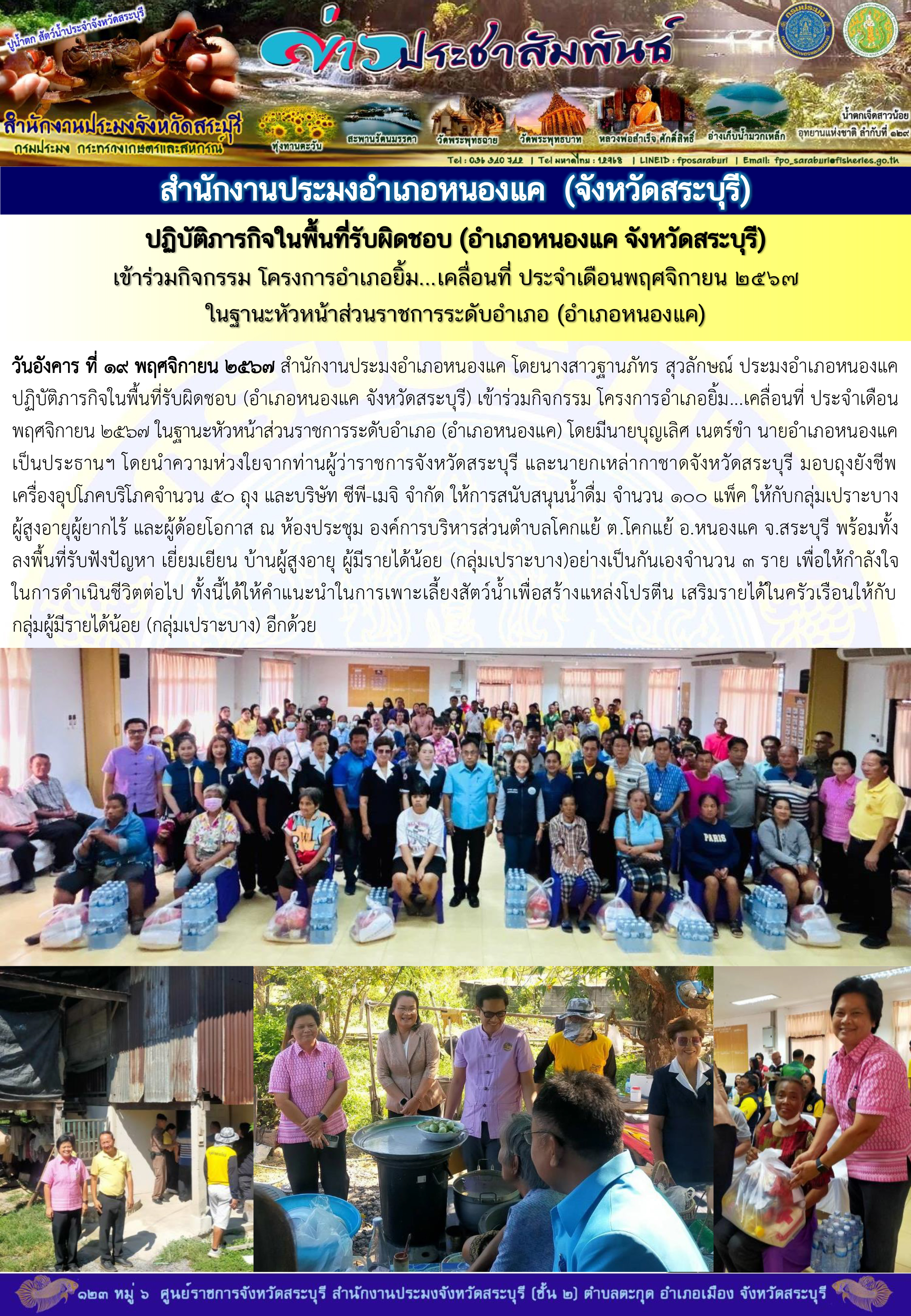 วันอังคาร ที่ 19 พฤศจิกายน 2567 สำนักงานประมงอำเภอหนองแค โดยนางสาวฐานภัทร สุวลักษณ์ ประมงอำเภอหนองแค ปฏิบัติภารกิจในพื้นที่รับผิดชอบ (อำเภอหนองแค จังหวัดสระบุรี) เข้าร่วมกิจกรรม โครงการอำเภอยิ้ม...เคลื่อนที่ ประจำเดือนพฤศจิกายน 2567 ในฐานะหัวหน้าส่วนราชการระดับอำเภอ (อำเภอหนองแค) โดยมีนายบุญเลิศ เนตร์ขำ นายอำเภอหนองแค เป็นประธานฯ โดยนำความห่วงใยจากท่านผู้ว่าราชการจังหวัดสระบุรี และนายกเหล่ากาชาดจังหวัดสระบุรี มอบถุงยังชีพเครื่องอุปโภคบริโภคจำนวน 50 ถุง และบริษัท ซีพี-เมจิ จำกัด ให้การสนับสนุนน้ำดื่ม จำนวน 100 แพ็ค ให้กับกลุ่มเปราะบาง ผู้สูงอายุผู้ยากไร้ และผู้ด้อยโอกาส ณ ห้องประชุม องค์การบริหารส่วนตำบลโคกแย้ ต.โคกแย้ อ.หนองแค จ.สระบุรี พร้อมทั้งลงพื้นที่รับฟังปัญหา เยี่ยมเยียน บ้านผู้สูงอายุ ผู้มีรายได้น้อย (กลุ่มเปราะบาง)อย่างเป็นกันเองจำนวน 3 ราย เพื่อให้กำลังใจในการดำเนินชีวิตต่อไป ทั้งนี้ได้ให้คำแนะนำในการเพาะเลี้ยงสัตว์น้ำเพื่อสร้างแหล่งโปรตีน เสริมรายได้ในครัวเรือนให้กับกลุ่มผู้มีรายได้น้อย (กลุ่มเปราะบาง) อีกด้วย