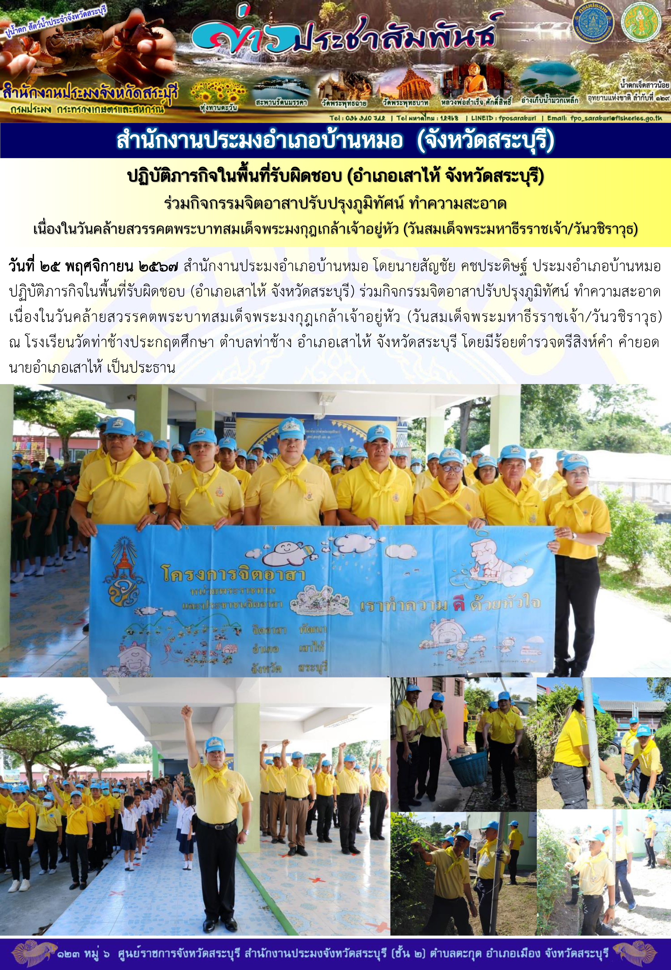 วันที่ 25 พฤศจิกายน 2567 สำนักงานประมงอำเภอบ้านหมอ โดยนายสัญชัย คชประดิษฐ์ ประมงอำเภอบ้านหมอ ปฏิบัติภารกิจในพื้นที่รับผิดชอบ (อำเภอเสาไห้ จังหวัดสระบุรี) ร่วมกิจกรรมจิตอาสาปรับปรุงภูมิทัศน์ ทำความสะอาด เนื่องในวันคล้ายสวรรคตพระบาทสมเด็จพระมงกุฎเกล้าเจ้าอยู่หัว (วันสมเด็จพระมหาธีรราชเจ้า/วันวชิราวุธ) ณ โรงเรียนวัดท่าช้างประกฤตศึกษา ตำบลท่าช้าง อำเภอเสาไห้ จังหวัดสระบุรี โดยมีร้อยตำรวจตรีสิงห์คำ คำยอด นายอำเภอเสาไห้ เป็นประธาน