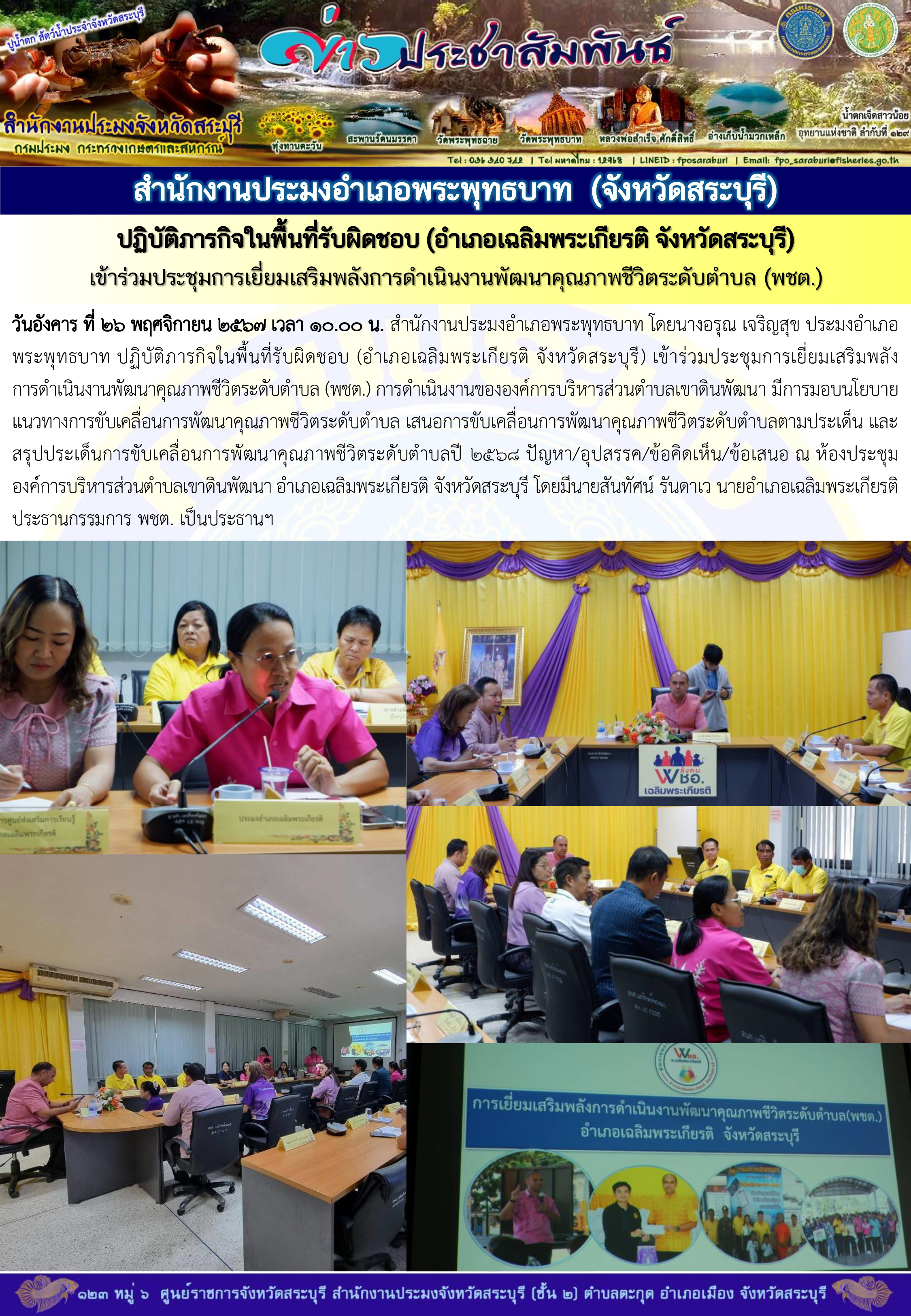 สำนักงานประมงอำเภอพระพุทธบาท ปฏิบัติภารกิจในพื้นที่รับผิดชอบ (อำเภอเฉลิมพระเกียรติ จังหวัดสระบุรี) เข้าร่วมประชุมการเยี่ยมเสริมพลังการดำเนินงานพัฒนาคุณภาพชีวิตระดับตำบล (พชต.)