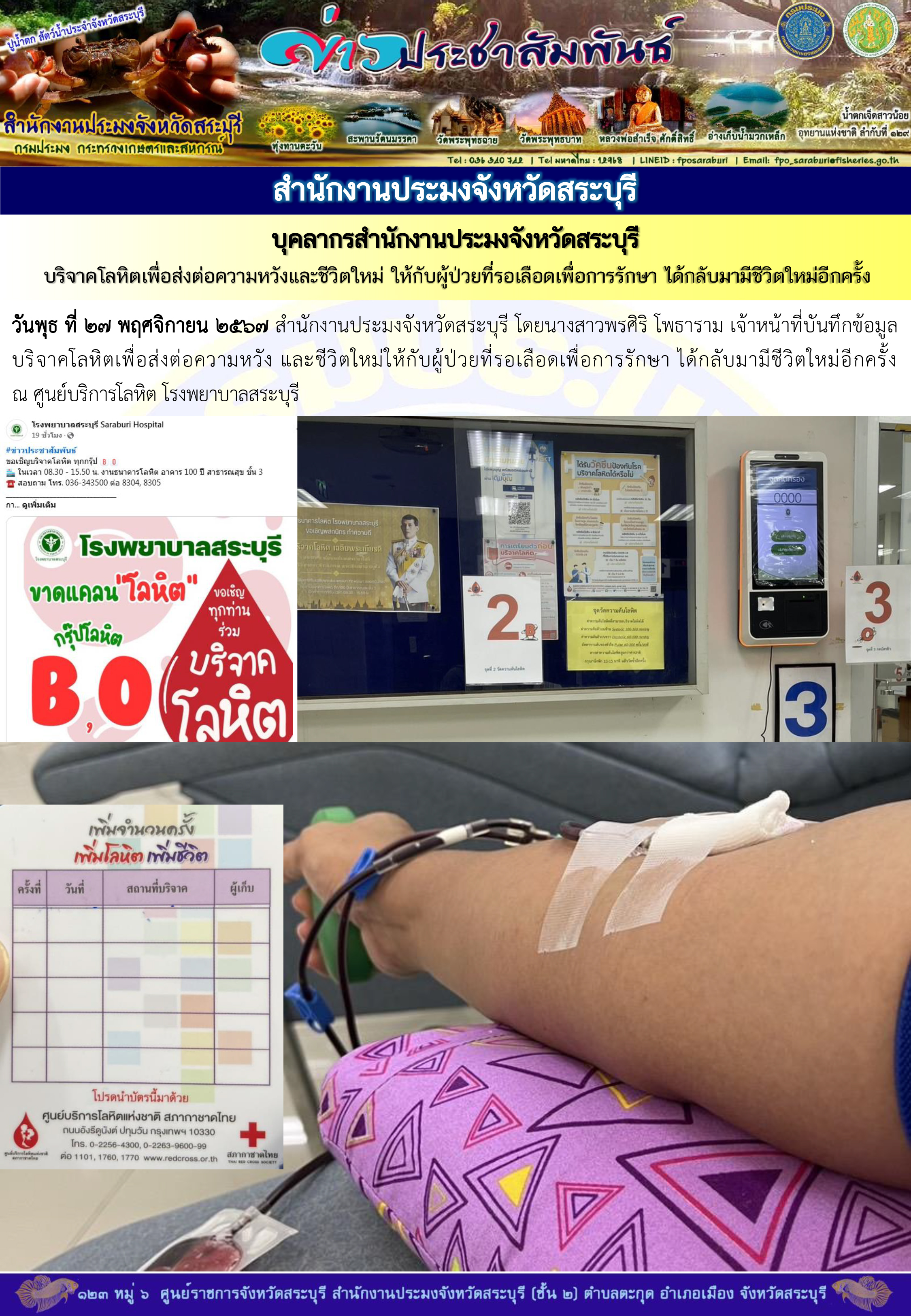 วันพุธ ที่ 27 พฤศจิกายน 2567 สำนักงานประมงจังหวัดสระบุรี โดยนางสาวพรศิริ โพธาราม เจ้าหน้าที่บันทึกข้อมูล บริจาคโลหิตเพื่อส่งต่อความหวัง และชีวิตใหม่ให้กับผู้ป่วยที่รอเลือดเพื่อการรักษาได้กลับมามีชีวิตใหม่อีกครั้ง ณ ศูนย์บริการโลหิต โรงพยาบาลสระบุรี