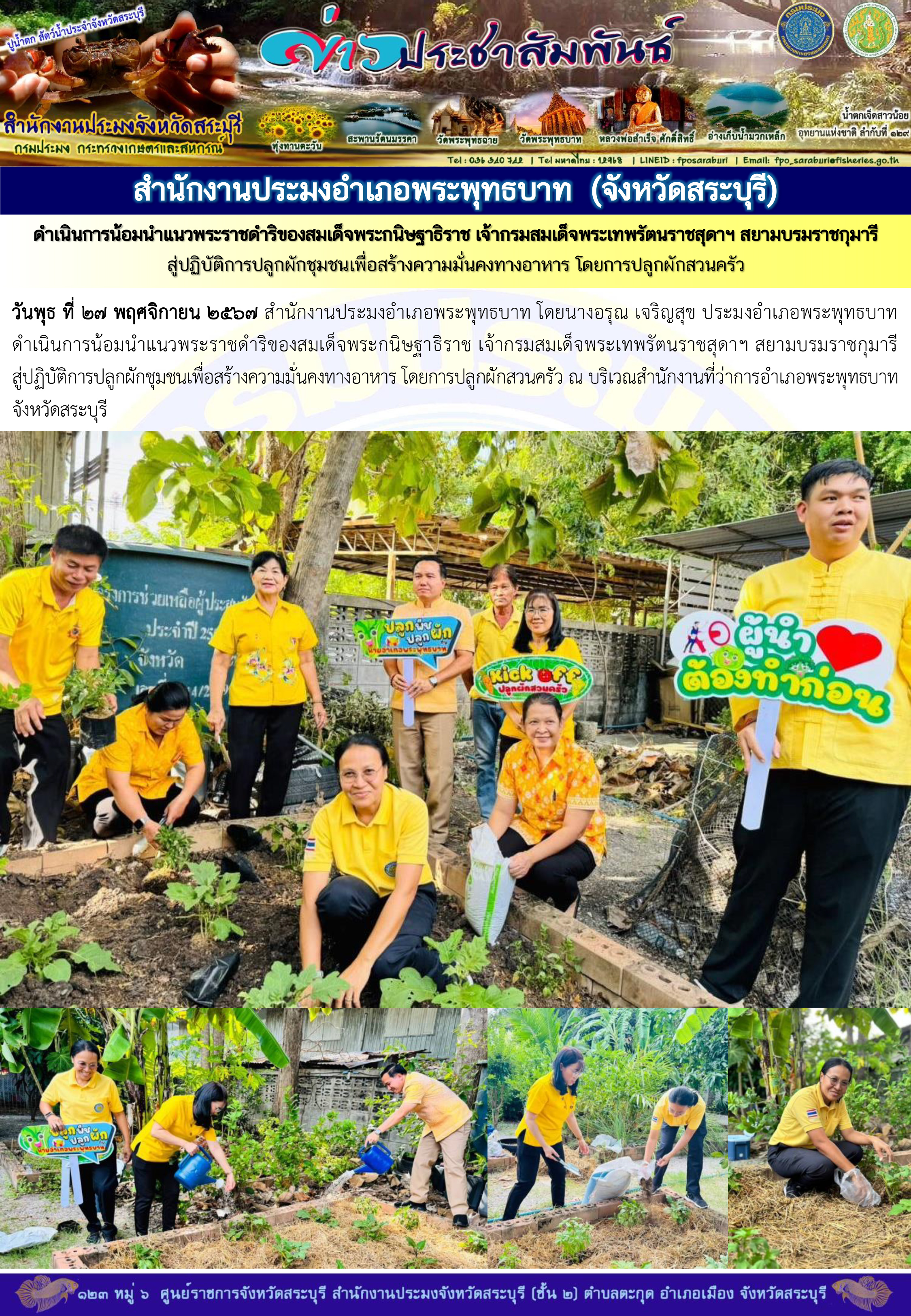 สำนักงานประมงอำเภอพระพุทธบาท ดำเนินการน้อมนำแนวพระราชดำริของสมเด็จพระกนิษฐาธิราช เจ้ากรมสมเด็จพระเทพรัตนราชสุดาฯ สยามบรมราชกุมารี สู่ปฏิบัติการปลูกผักชุมชนเพื่อสร้างความมั่นคงทางอาหาร โดยการปลูกผักสวนครัว