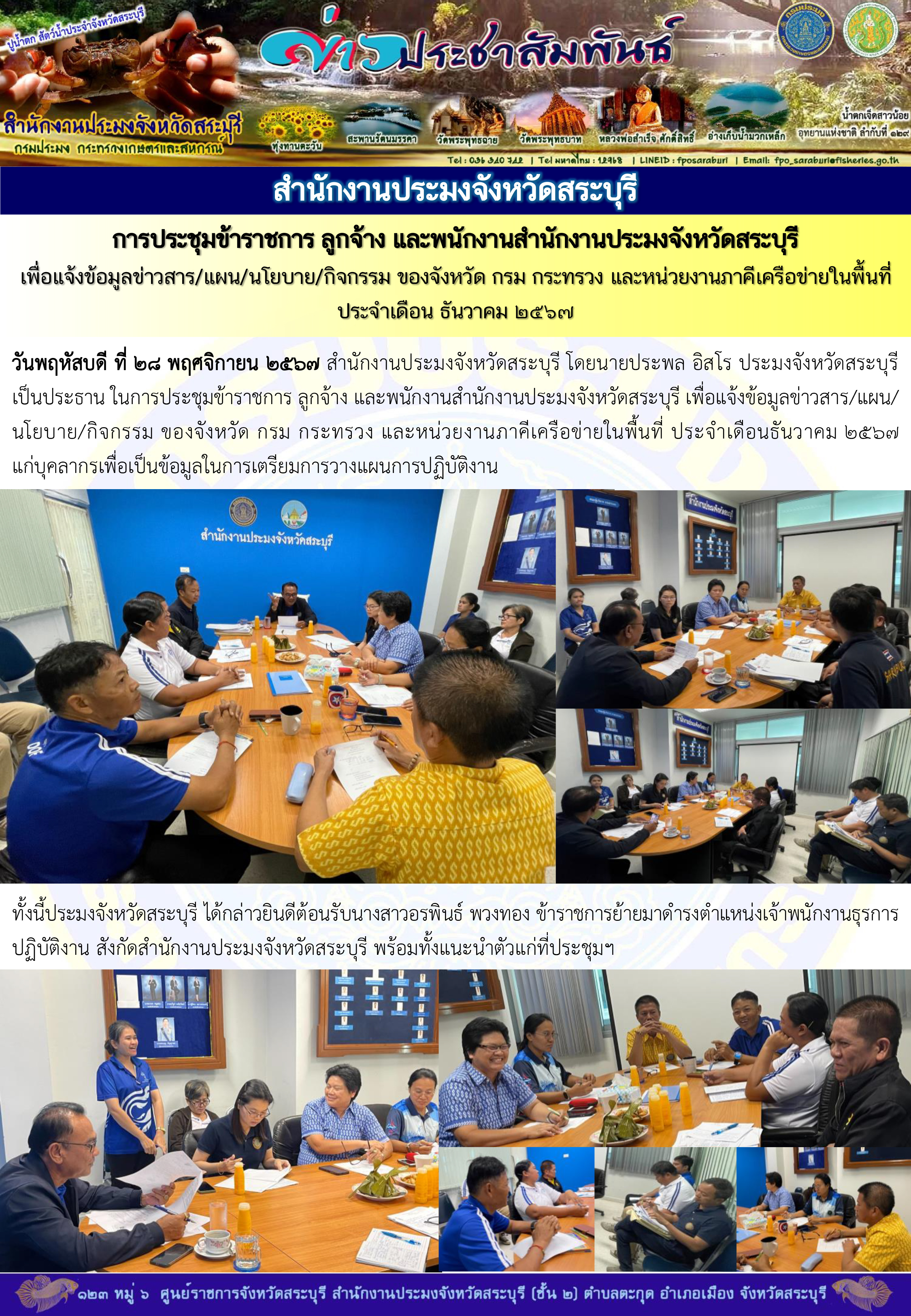สำนักงานประมงจังหวัดสระบุรี การประชุมข้าราชการ ลูกจ้าง และพนักงานสำนักงานประมงจังหวัดสระบุรี เพื่อแจ้งข้อมูลข่าวสาร/แผน/นโยบาย/กิจกรรม ของจังหวัด กรม กระทรวง และหน่วยงานภาคีเครือข่ายในพื้นที่ ประจำเดือนธันวาคม 2567