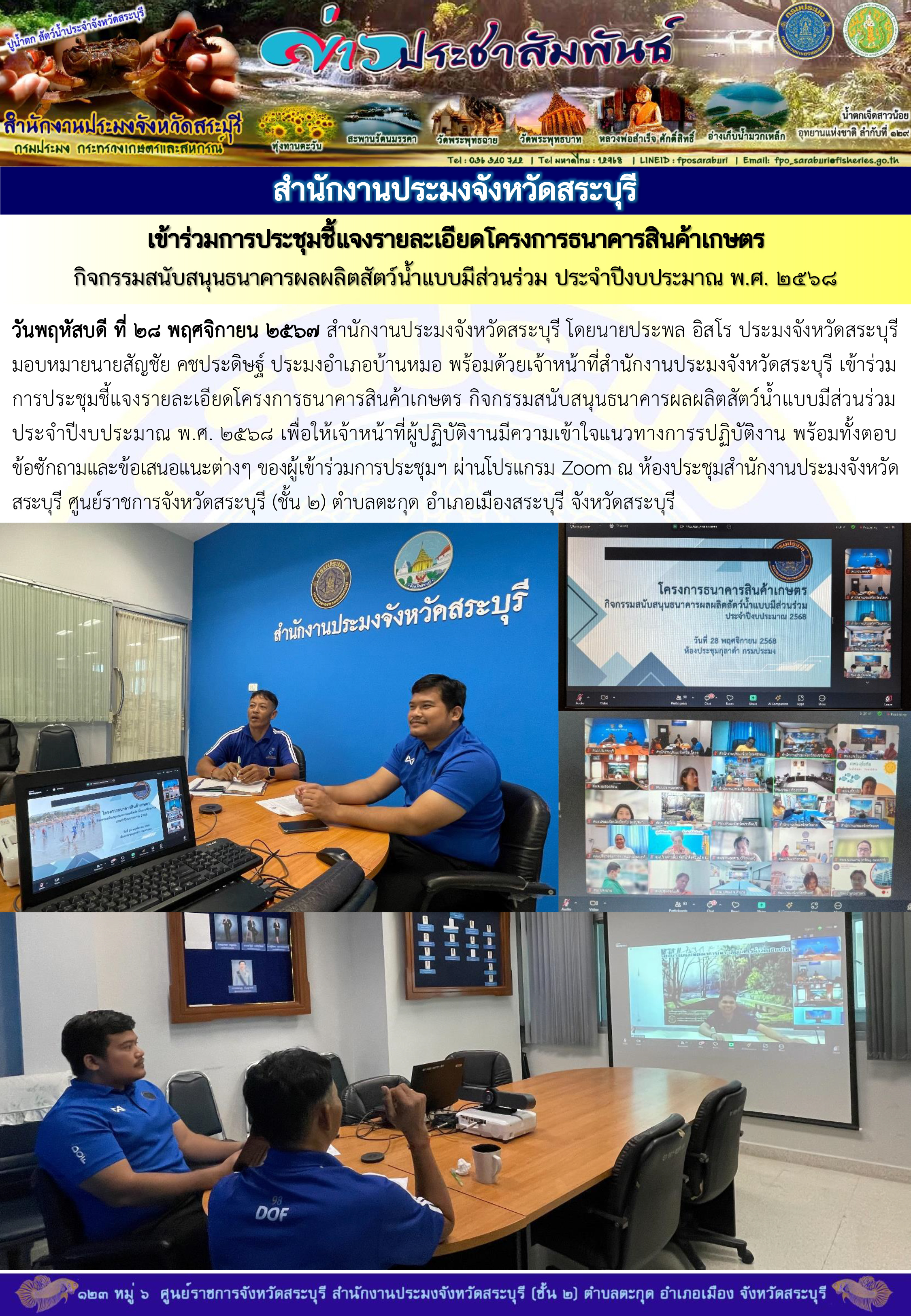วันพฤหัสบดี ที่ 28 พฤศจิกายน 2567 สำนักงานประมงจังหวัดสระบุรี โดยนายประพล อิสโร ประมงจังหวัดสระบุรี มอบหมายนายสัญชัย คชประดิษฐ์ ประมงอำเภอบ้านหมอ พร้อมด้วยเจ้าหน้าที่สำนักงานประมงจังหวัดสระบุรี เข้าร่วมการประชุมชี้แจงรายละเอียดโครงการธนาคารสินค้าเกษตร กิจกรรมสนับสนุนธนาคารผลผลิตสัตว์น้ำแบบมีส่วนร่วม ประจำปีงบประมาณ พ.ศ. 2568 เพื่อให้เจ้าหน้าที่ผู้ปฏิบัติงานมีความเข้าใจแนวทางการรปฏิบัติงาน พร้อมทั้งตอบข้อซักถามและข้อเสนอแนะต่างๆ ของผู้เข้าร่วมการประชุมฯ ผ่านโปรแกรม Zoom ณ ห้องประชุมสำนักงานประมงจังหวัดสระบุรี ศูนย์ราชการจังหวัดสระบุรี (ชั้น2) ตำบลตะกุด อำเภอเมืองสระบุรี จังหวัดสระบุรี