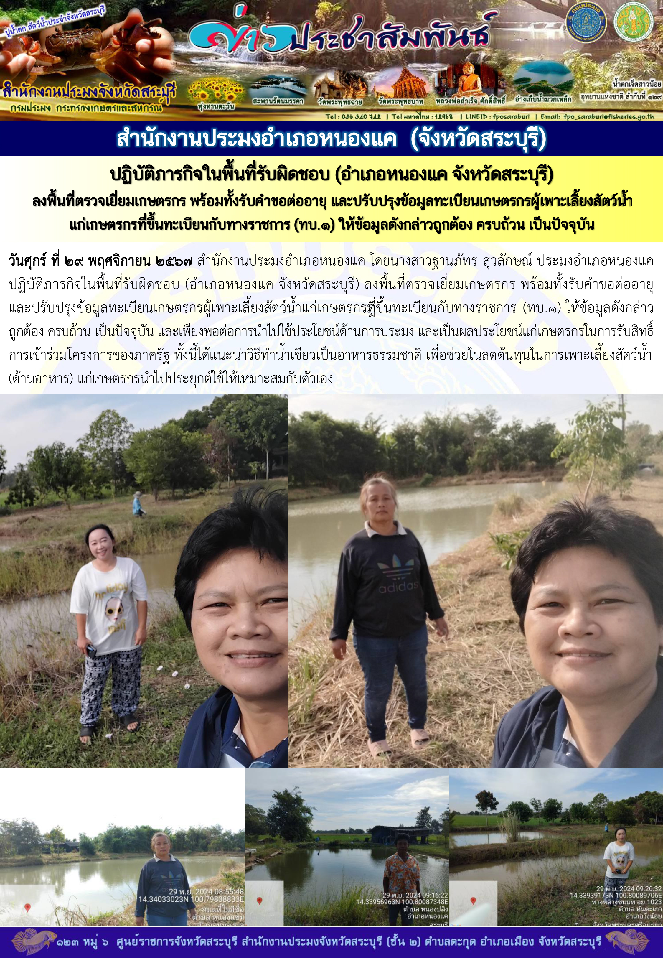 สำนักงานประมงอำเภอหนองแค ปฏิบัติภารกิจในพื้นที่รับผิดชอบ (อำเภอหนองแค จังหวัดสระบุรี) ลงพื้นที่ตรวจเยี่ยมเกษตรกร พร้อมทั้งรับคำขอต่ออายุ และปรับปรุงข้อมูลทะเบียนเกษตรกรผู้เพาะเลี้ยงสัตว์น้ำแก่เกษตรกรที่่ขึ้นทะเบียนกับทางราชการ (ทบ.๑) ให้ข้อมูลดังกล่าวถูกต้อง ครบถ้วน เป็นปัจจุบัน