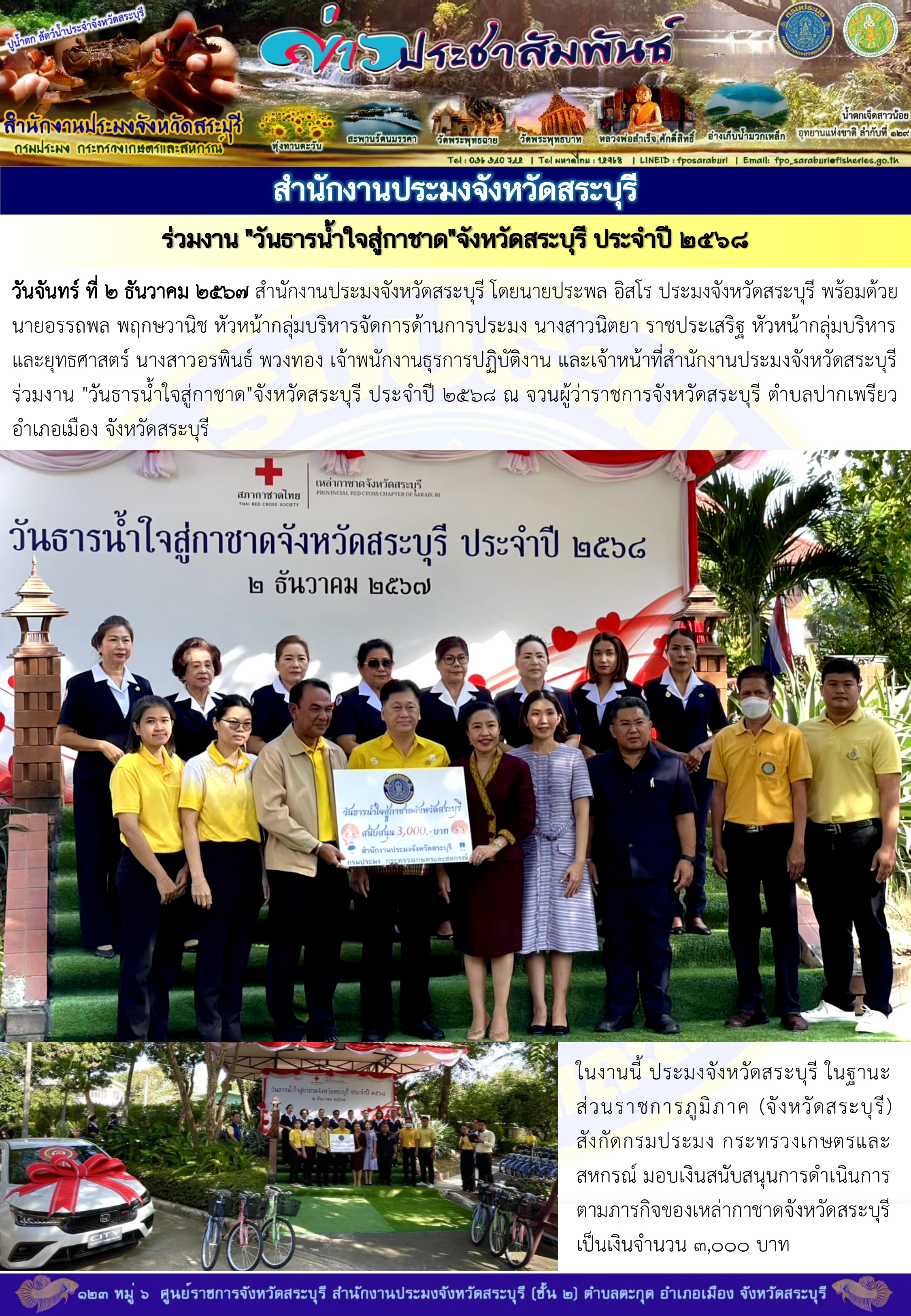 วันจันทร์ ที่ 2 ธันวาคม 2567 สำนักงานประมงจังหวัดสระบุรี โดยนายประพล อิสโร ประมงจังหวัดสระบุรี พร้อมด้วยนายอรรถพล พฤกษวานิช หัวหน้ากลุ่มบริหารจัดการด้านการประมง นางสาวนิตยา ราชประเสริฐ หัวหน้ากลุ่มบริหารและยุทธศาสตร์ นางสาวอรพินธ์ พวงทอง เจ้าพนักงานธุรการปฏิบัติงาน และเจ้าหน้าที่สำนักงานประมงจังหวัดสระบุรี ร่วมงาน "วันธารน้ำใจสู่กาชาด"จังหวัดสระบุรี ประจำปี 2568 ณ จวนผู้ว่าราชการจังหวัดสระบุรี ตำบลปากเพรียว อำเภอเมือง จังหวัดสระบุรี