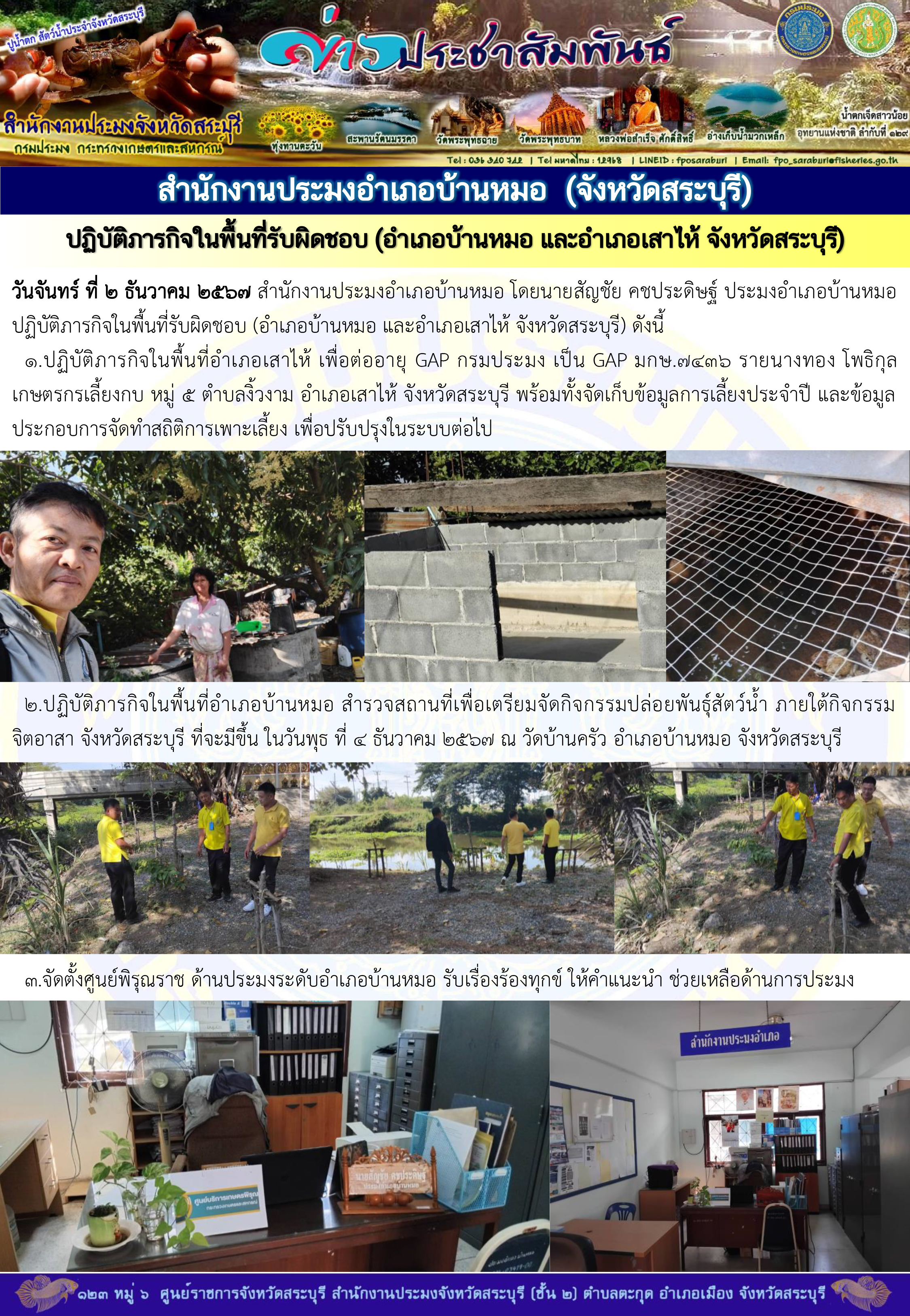 ภารกิจประจำวันที่ 2 ธันวาคม 2567 สำนักงานประมงจังหวัดสระบุรี