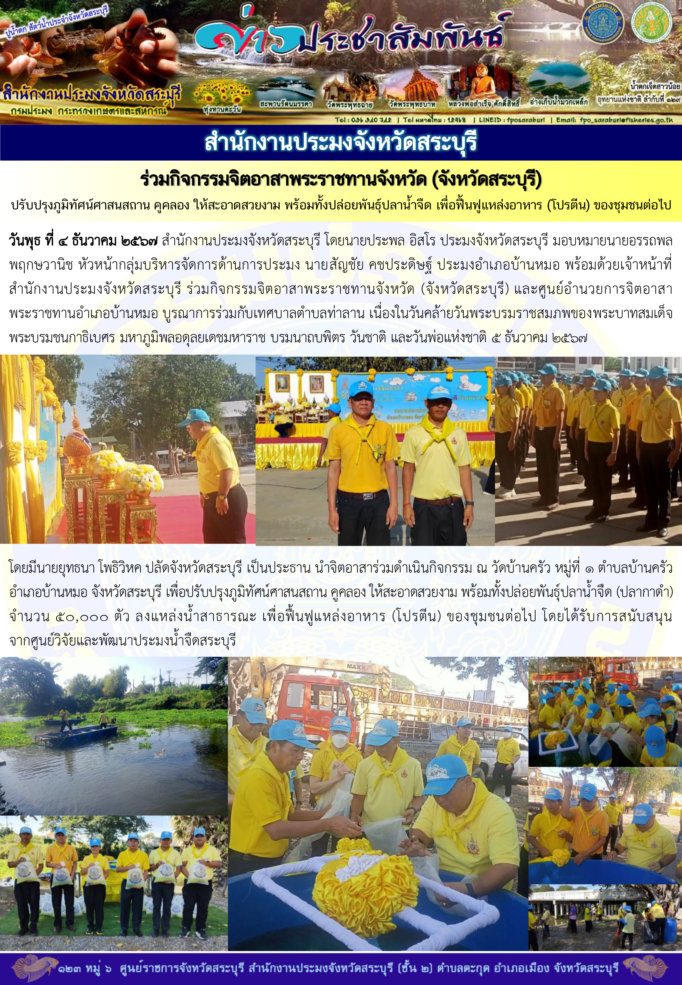 สำนักงานประมงจังหวัดสระบุรี ร่วมกิจกรรมจิตอาสาพระราชทานจังหวัด (จังหวัดสระบุรี) ปรับปรุงภูมิทัศน์ศาสนสถาน คูคลอง ให้สะอาดสวยงาม พร้อมทั้งปล่อยพันธุ์ปลาน้ำจืด เพื่อฟื้นฟูแหล่งอาหาร (โปรตีน) ของชุมชนต่อไป