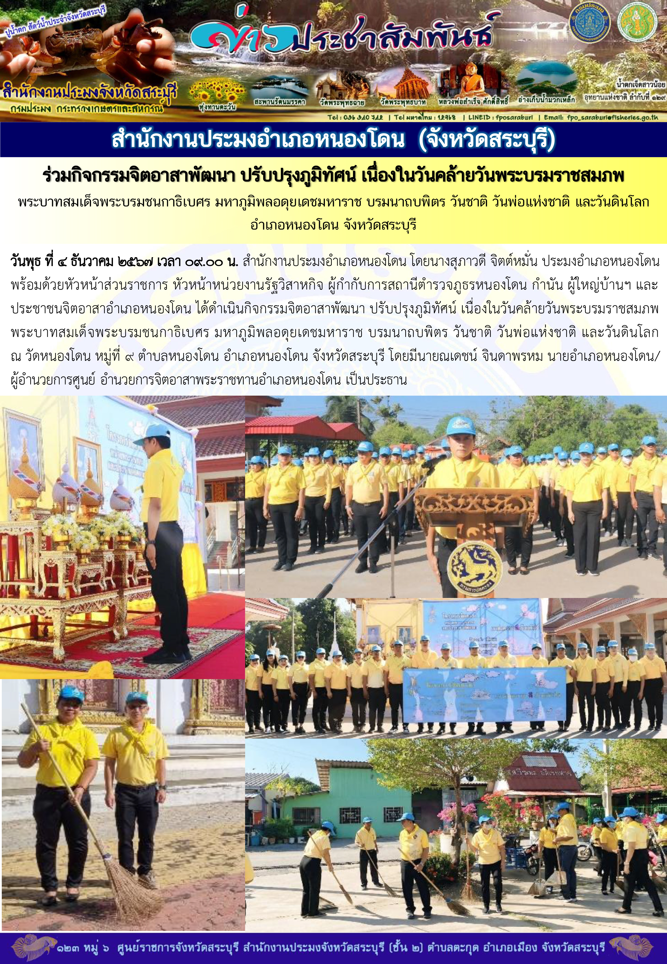 สำนักงานประมงอำเภอหนองโดน ร่วมกิจกรรมจิตอาสาพัฒนา ปรับปรุงภูมิทัศน์ เนื่องในวันคล้ายวันพระบรมราชสมภพ พระบาทสมเด็จพระบรมชนกาธิเบศร มหาภูมิพลอดุยเดชมหาราช บรมนาถบพิตร วันชาติ วันพ่อแห่งชาติ และวันดินโลก อำเภอหนองโดน จังหวัดสระบุรี