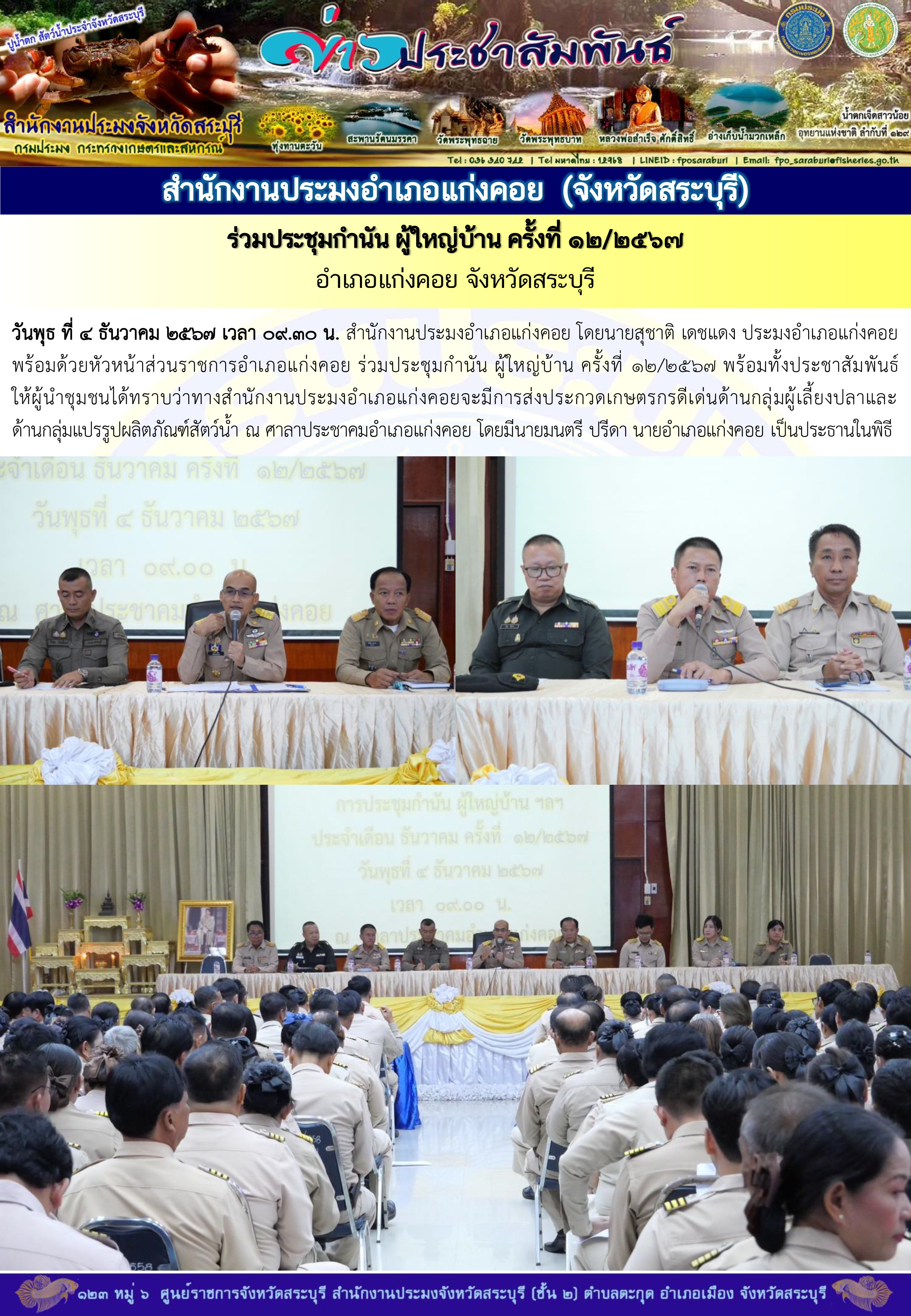 สำนักงานประมงอำเภอแก่งคอย ร่วมประชุมกำนัน ผู้ใหญ่บ้าน ครั้งที่ 12/2567 อำเภอแก่งคอย จังหวัดสระบุรี