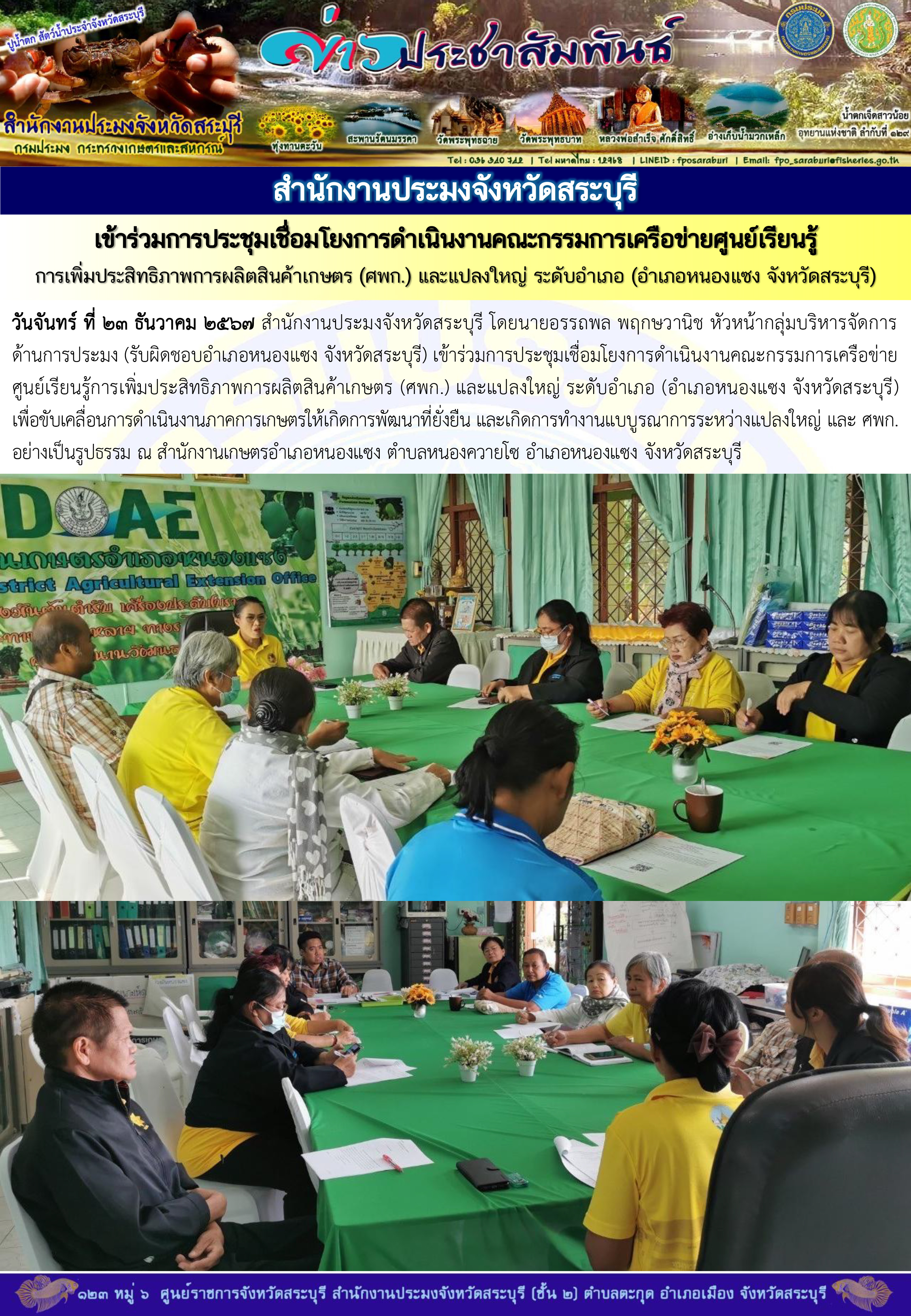 วันจันทร์ ที่ 23 ธันวาคม 2567 สำนักงานประมงจังหวัดสระบุรี โดยนายอรรถพล พฤกษวานิช หัวหน้ากลุ่มบริหารจัดการด้านการประมง (รับผิดชอบอำเภอหนองแซง จังหวัดสระบุรี) เข้าร่วมการประชุมเชื่อมโยงการดำเนินงานคณะกรรมการเครือข่ายศูนย์เรียนรู้การเพิ่มประสิทธิภาพการผลิตสินค้าเกษตร (ศพก.) และแปลงใหญ่ ระดับอำเภอ (อำเภอหนองแซง จังหวัดสระบุรี) เพื่อขับเคลื่อนการดำเนินงานภาคการเกษตรให้เกิดการพัฒนาที่ยั่งยืน และเกิดการทำงานแบบูรณาการระหว่างแปลงใหญ่ และ ศพก. อย่างเป็นรูปธรรม ณ สำนักงานเกษตรอำเภอหนองแซง ตำบลหนองควายโซ อำเภอหนองแซง จังหวัดสระบุรี