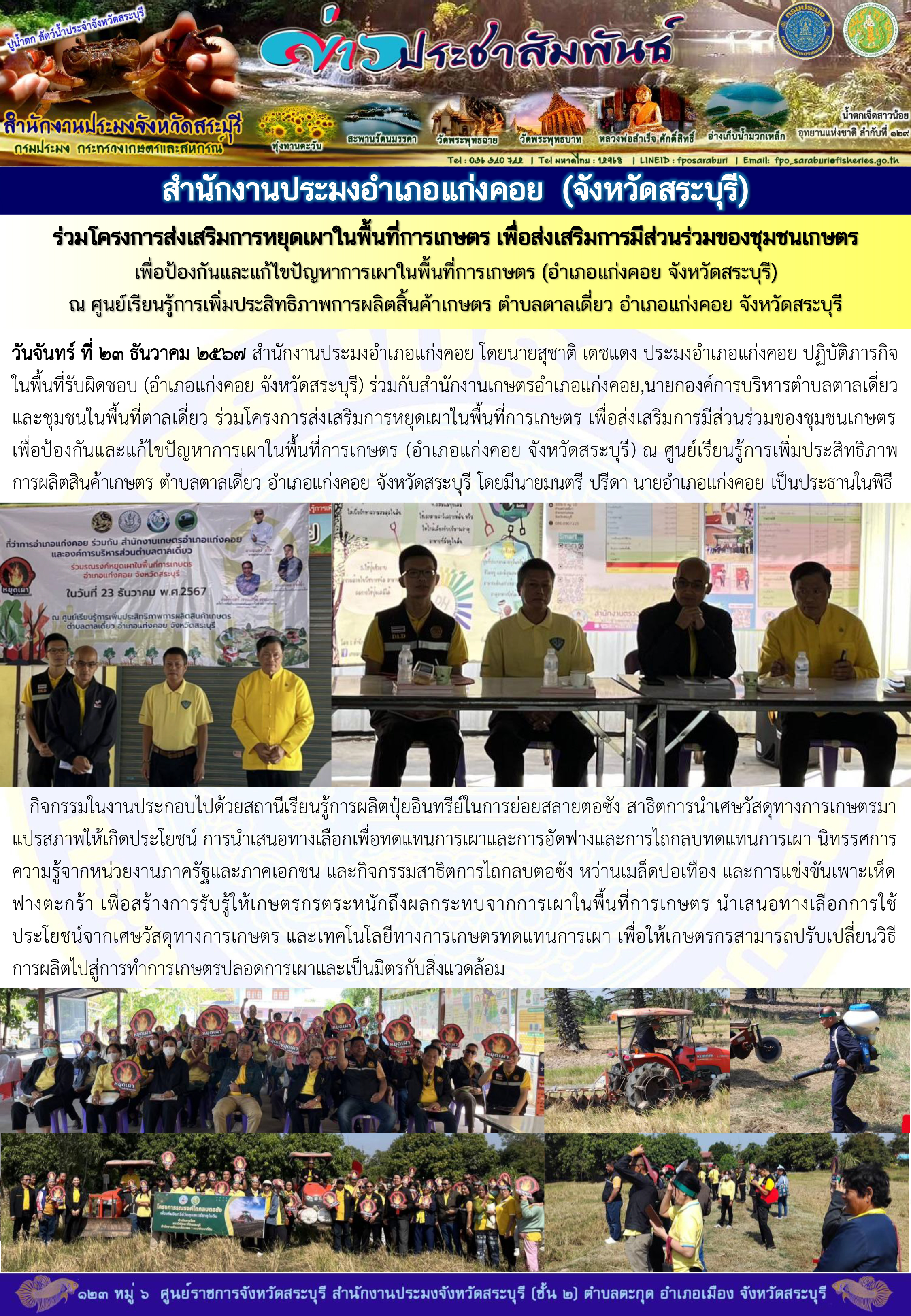 สำนักงานประมงอำเภอแก่งคอย ร่วมโครงการส่งเสริมการหยุดเผาในพื้นที่การเกษตร เพื่อส่งเสริมการมีส่วนร่วมของชุมชนเกษตรเพื่อป้องกันและแก้ไขปัญหาการเผาในพื้นที่การเกษตร (อำเภอแก่งคอย จังหวัดสระบุรี) ณ ศูนย์เรียนรู้การเพิ่มประสิทธิภาพการผลิตสิ้นค้าเกษตร ตำบลตาลเดี่ยว อำเภอแก่งคอย จังหวัดสระบุรี
