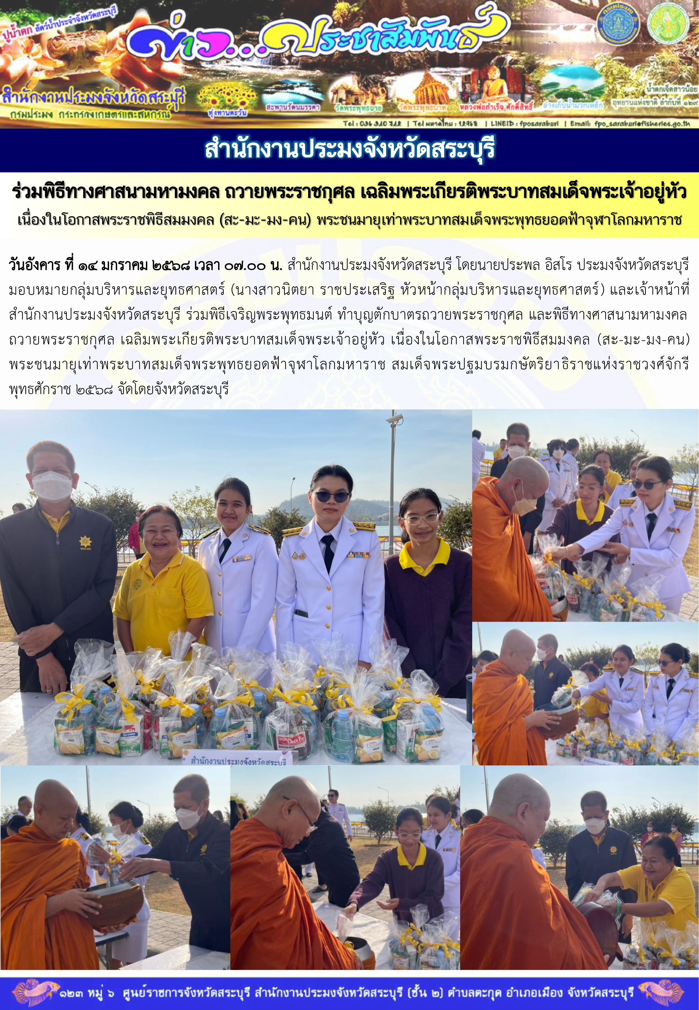 สำนักงานประมงจังหวัดสระบุรี ร่วมพิธีทางศาสนามหามงคล ถวายพระราชกุศล เฉลิมพระเกียรติพระบาทสมเด็จพระเจ้าอยู่หัว เนื่องในโอกาสพระราชพิธีสมมงคล (สะ-มะ-มง-คน) พระชนมายุเท่าพระบาทสมเด็จพระพุทธยอดฟ้าจุฬาโลกมหาราช