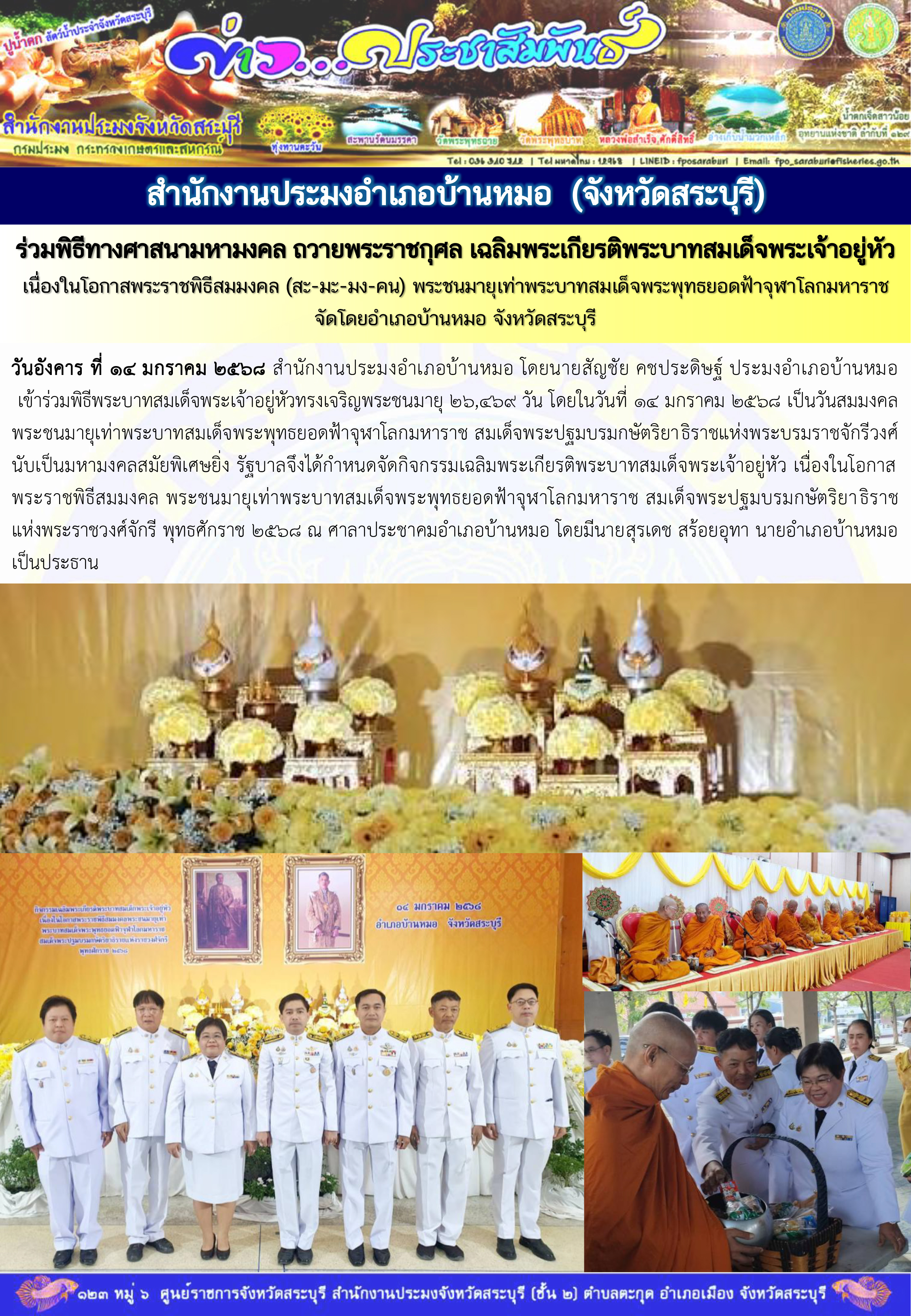 สำนักงานประมงอำเภอบ้านหมอ ร่วมพิธีทางศาสนามหามงคล ถวายพระราชกุศล เฉลิมพระเกียรติพระบาทสมเด็จพระเจ้าอยู่หัว เนื่องในโอกาสพระราชพิธีสมมงคล (สะ-มะ-มง-คน) พระชนมายุเท่าพระบาทสมเด็จพระพุทธยอดฟ้าจุฬาโลกมหาราช จัดโดยอำเภอบ้านหมอ จังหวัดสระบุรี