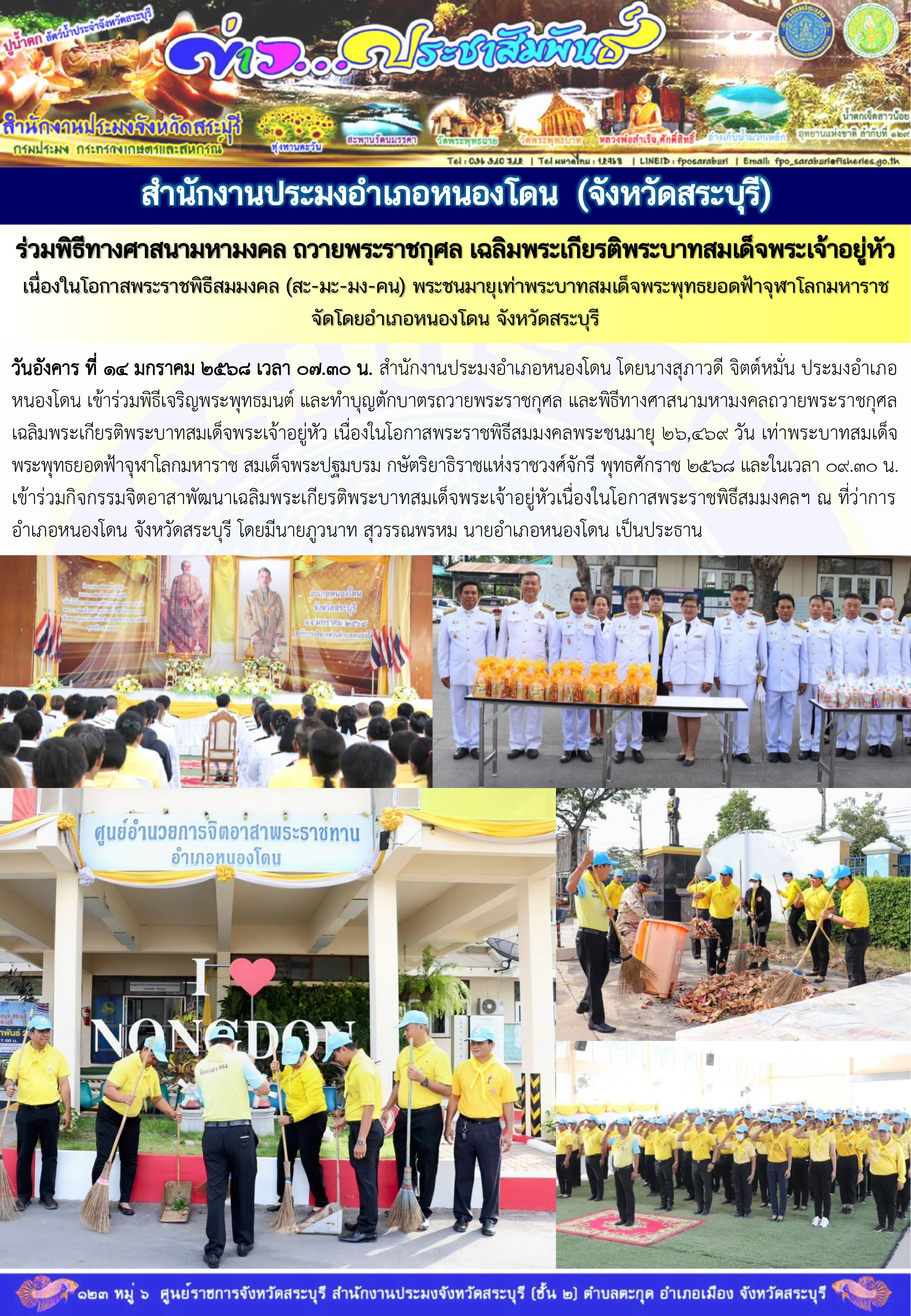 สำนักงานประมงอำเภอหนองโดน ร่วมพิธีทางศาสนามหามงคล ถวายพระราชกุศล เฉลิมพระเกียรติพระบาทสมเด็จพระเจ้าอยู่หัว เนื่องในโอกาสพระราชพิธีสมมงคล (สะ-มะ-มง-คน) พระชนมายุเท่าพระบาทสมเด็จพระพุทธยอดฟ้าจุฬาโลกมหาราช จัดโดยอำเภอหนองโดน จังหวัดสระบุรี