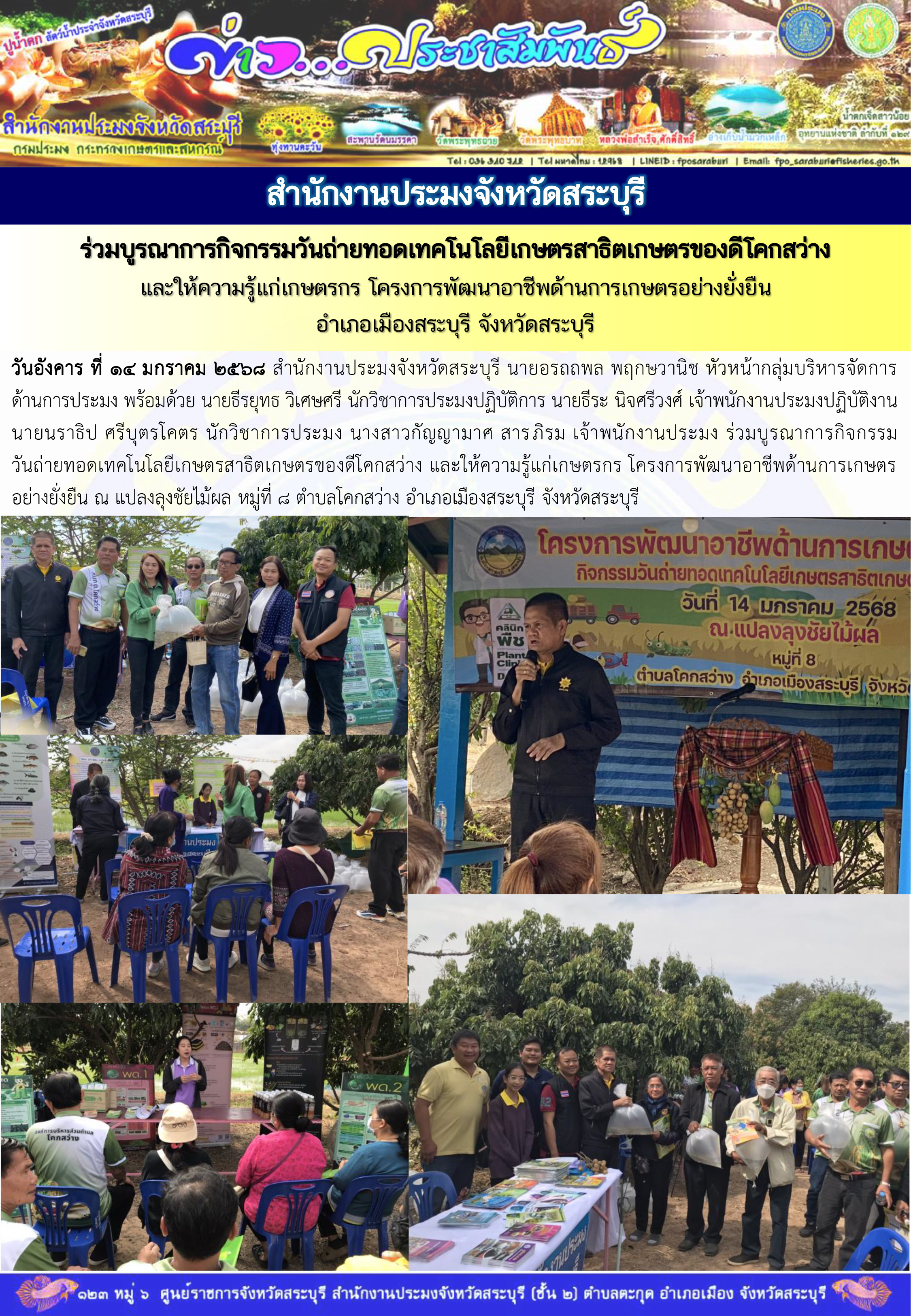วันอังคาร ที่ 14 มกราคม 2568 สำนักงานประมงจังหวัดสระบุรี นายอรถถพล พฤกษวานิช หัวหน้ากลุ่มบริหารจัดการด้านการประมง พร้อมด้วย นายธีรยุทธ วิเศษศรี นักวิชาการประมงปฏิบัติการ นายธีระ นิจศรีวงศ์ เจ้าพนักงานประมงปฏิบัติงาน นายนราธิป ศรีบุตรโคตร นักวิชาการประมง นางสาวกัญญามาศ สารภิรม เจ้าพนักงานประมง ร่วมบูรณาการกิจกรรมวันถ่ายทอดเทคโนโลยีเกษตรสาธิตเกษตรของดีโคกสว่าง และให้ความรู้แก่เกษตรกร โครงการพัฒนาอาชีพด้านการเกษตรอย่างยั่งยืน ณ แปลงลุงชัยไม้ผล หมู่ที่ 8 ตำบลโคกสว่าง อำเภอเมืองสระบุรี จังหวัดสระบุรี