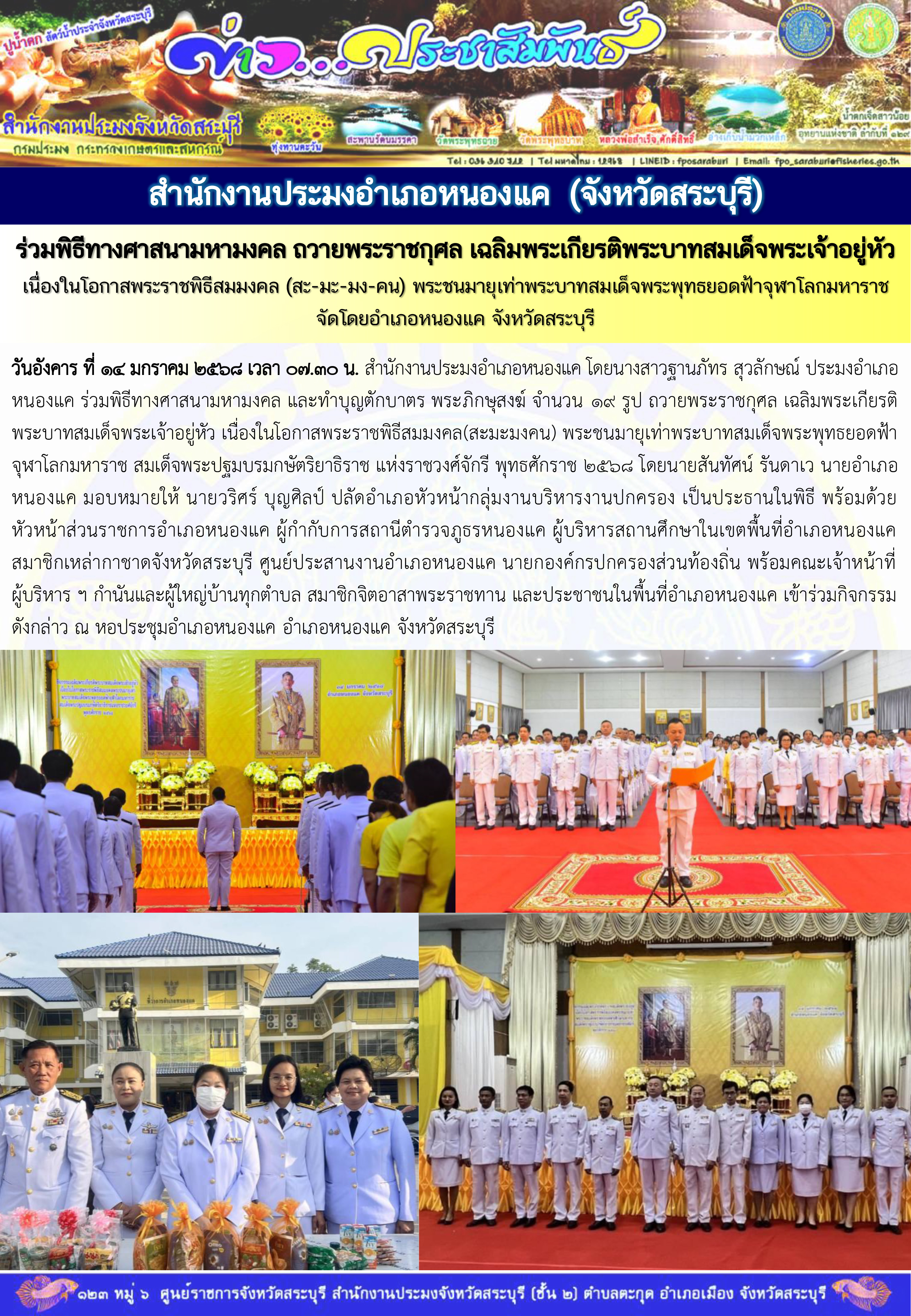 วันอังคาร ที่ 14 มกราคม 2568 เวลา 07.30 น. สำนักงานประมงอำเภอหนองแค โดยนางสาวฐานภัทร สุวลักษณ์ ประมงอำเภอหนองแค ร่วมพิธีทางศาสนามหามงคล และทำบุญตักบาตร พระภิกษุสงฆ์ จำนวน 19 รูป ถวายพระราชกุศล เฉลิมพระเกียรติพระบาทสมเด็จพระเจ้าอยู่หัว เนื่องในโอกาสพระราชพิธีสมมงคล(สะมะมงคน) พระชนมายุเท่าพระบาทสมเด็จพระพุทธยอดฟ้าจุฬาโลกมหาราช สมเด็จพระปฐมบรมกษัตริยาธิราช แห่งราชวงศ์จักรี พุทธศักราช ๒๕๖๘ โดยนายสันทัศน์ รันดาเว นายอำเภอหนองแค มอบหมายให้ นายวริศร์ บุญศิลป์ ปลัดอำเภอหัวหน้ากลุ่มงานบริหารงานปกครอง เป็นประธานในพิธี พร้อมด้วยหัวหน้าส่วนราชการอำเภอหนองแค ผู้กำกับการสถานีตำรวจภูธรหนองแค ผู้บริหารสถานศึกษาในเขตพื้นที่อำเภอหนองแค สมาชิกเหล่ากาชาดจังหวัดสระบุรี ศูนย์ประสานงานอำเภอหนองแค นายกองค์กรปกครองส่วนท้องถิ่น พร้อมคณะเจ้าหน้าที่ผู้บริหาร ฯ กำนันและผู้ใหญ่บ้านทุกตำบล สมาชิกจิตอาสาพระราชทาน และประชาชนในพื้นที่อำเภอหนองแค เข้าร่วมกิจกรรมดังกล่าว ณ หอประชุมอำเภอหนองแค อำเภอหนองแค จังหวัดสระบุรี