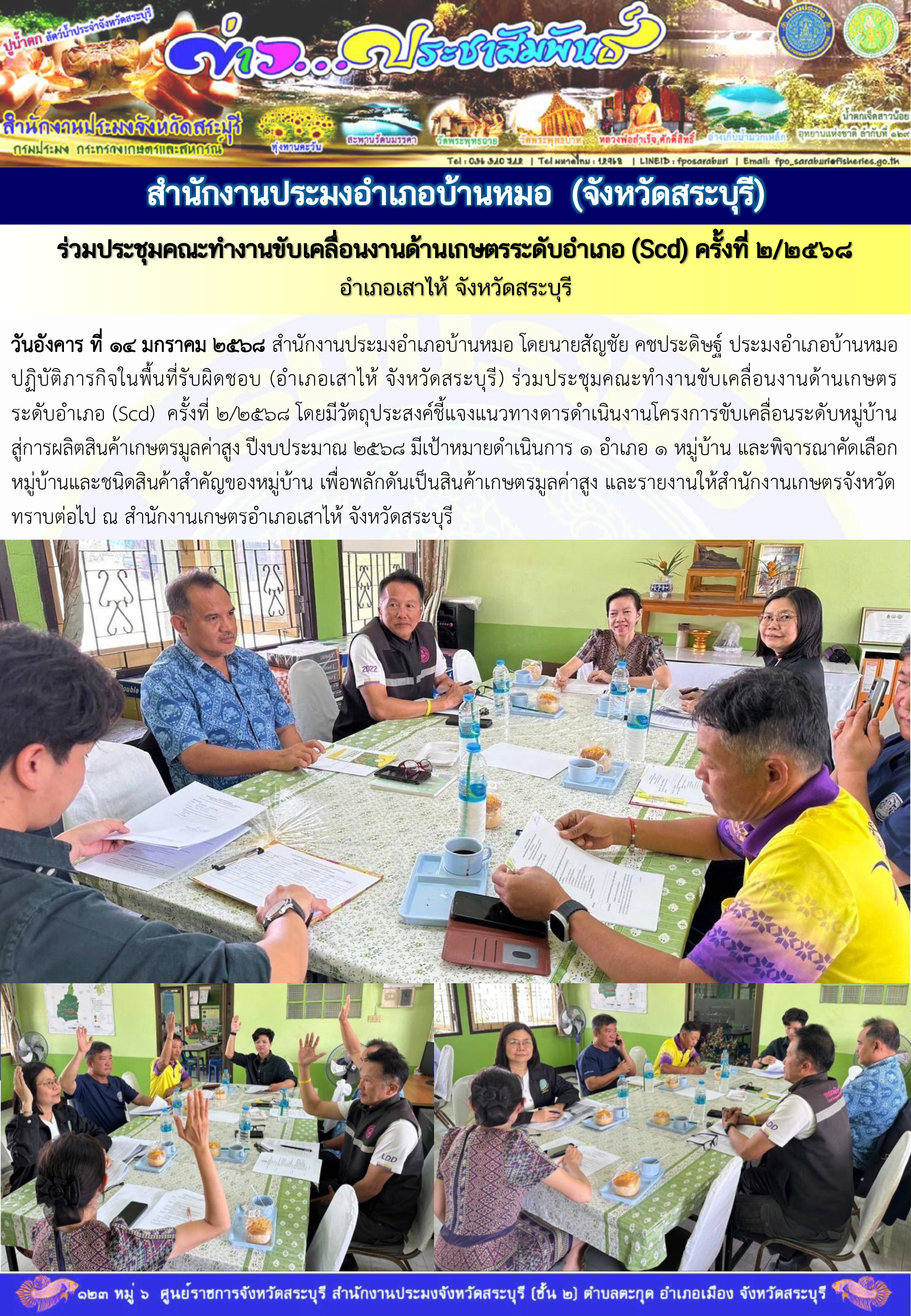 วันอังคาร ที่ 14 มกราคม 2568 สำนักงานประมงอำเภอบ้านหมอ โดยนายสัญชัย คชประดิษฐ์ ประมงอำเภอบ้านหมอ ปฏิบัติภารกิจในพื้นที่รับผิดชอบ (อำเภอเสาไห้ จังหวัดสระบุรี) ร่วมประชุมคณะทำงานขับเคลื่อนงานด้านเกษตรระดับอำเภอ (Scd) ครั้งที่ 2/2568 โดยมีวัตถุประสงค์ชี้แจงแนวทางดารดำเนินงานโครงการขับเคลื่อนระดับหมู่บ้านสู่การผลิตสินค้าเกษตรมูลค่าสูง ปีงบประมาณ 2568 มีเป้าหมายดำเนินการ 1 อำเภอ 1 หมู่บ้าน และพิจารณาคัดเลือกหมู่บ้านและชนิดสินค้าสำคัญของหมู่บ้าน เพื่อพลักดันเป็นสินค้าเกษตรมูลค่าสูง และรายงานให้สำนักงานเกษตรจังหวัดทราบต่อไป ณ สำนักงานเกษตรอำเภอเสาไห้ จังหวัดสระบุรี