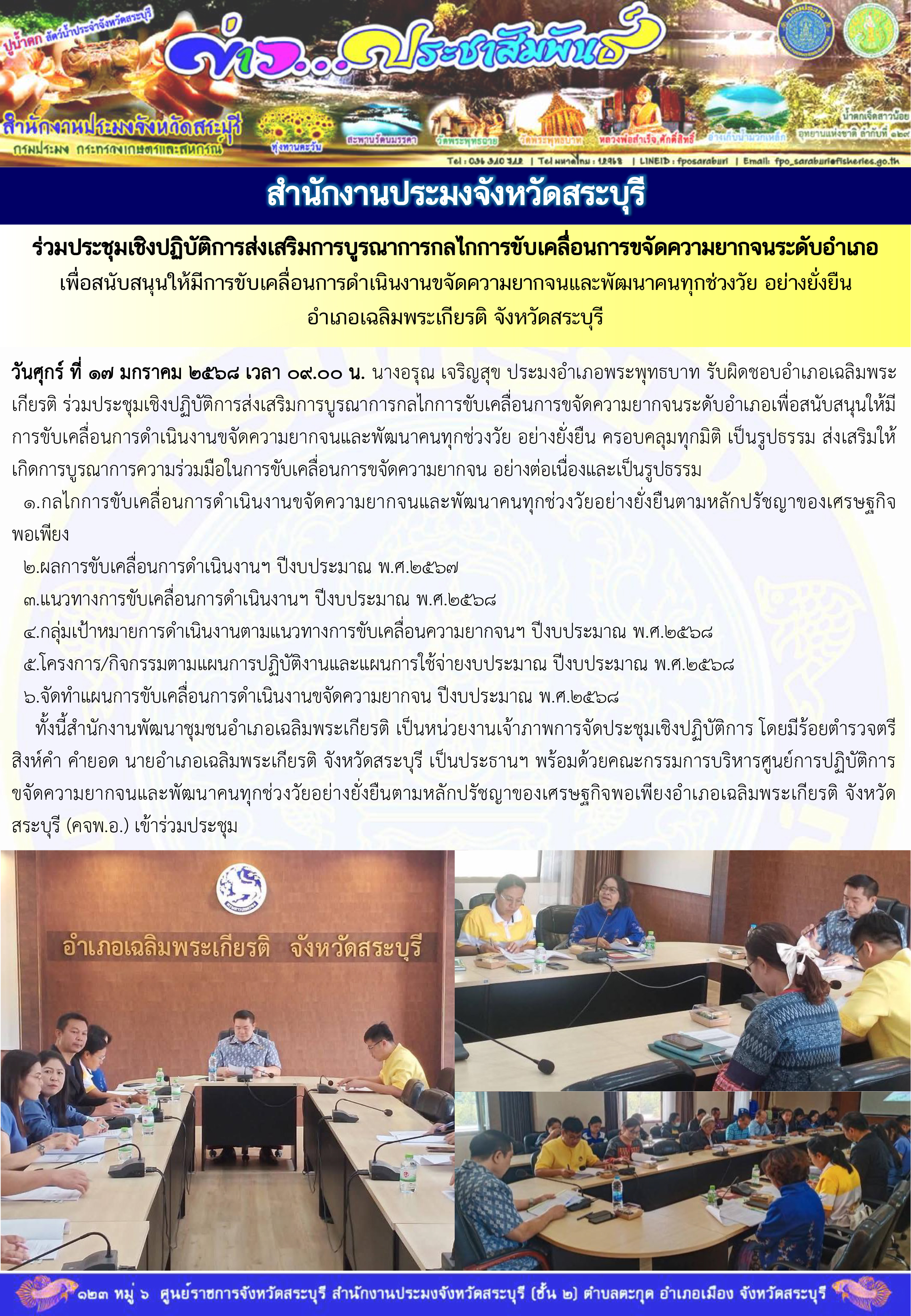 สำนักงานประมงอำเภอพระพุทธบาท ร่วมประชุมเชิงปฏิบัติการส่งเสริมการบูรณาการกลไกการขับเคลื่อนการขจัดความยากจนระดับอำเภอเพื่อสนับสนุนให้มีการขับเคลื่อนการดำเนินงานขจัดความยากจนและพัฒนาคนทุกช่วงวัย อย่างยั่งยืน อำเภอเฉลิมพระเกียรติ จังหวัดสระบุรี