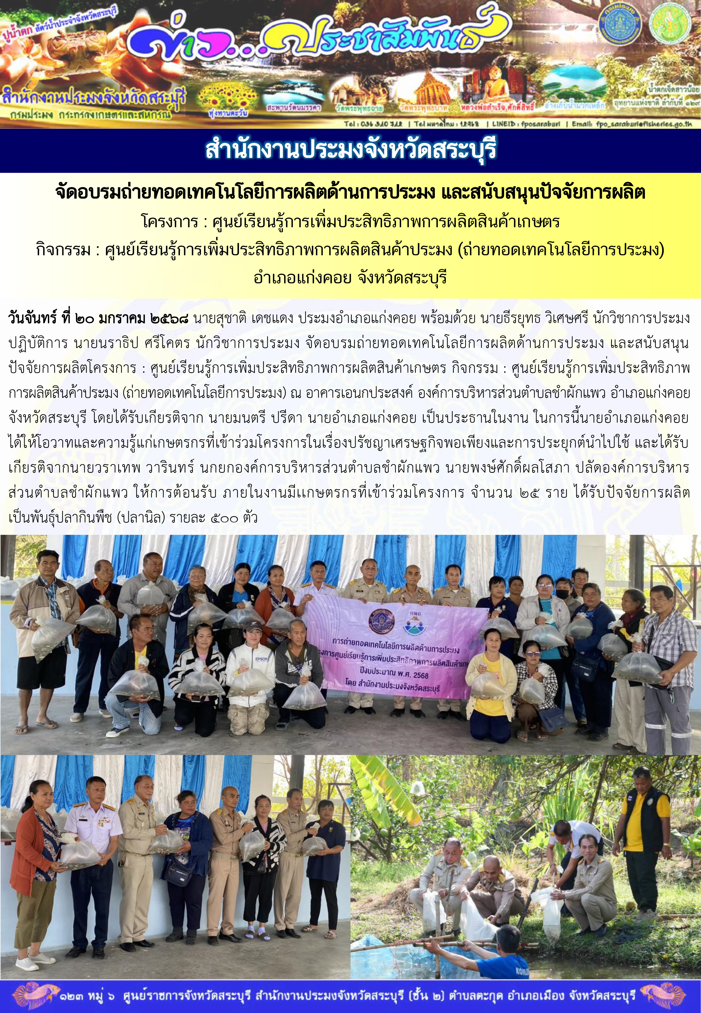 ภารกิจประจำวันที่ 20 มกราคม 2568 สำนักงานประมงจังหวัดสระบุรี