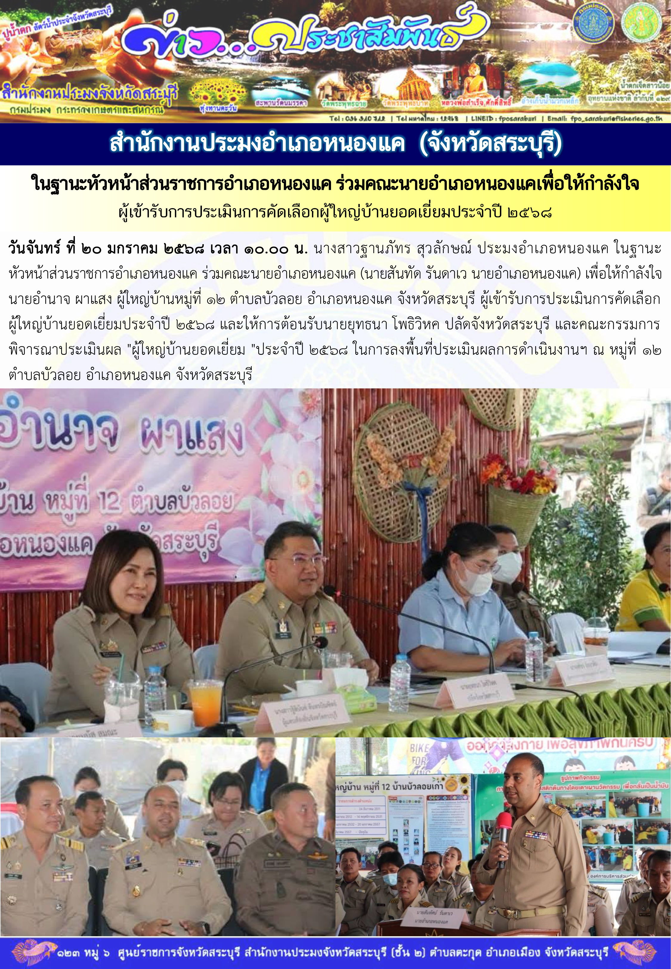วันจันทร์ ที่ 20 มกราคม 2568 เวลา 10.00 น. นางสาวฐานภัทร สุวลักษณ์ ประมงอำเภอหนองแค ในฐานะหัวหน้าส่วนราชการอำเภอหนองแค ร่วมคณะนายอำเภอหนองแค (นายสันทัด รันดาเว นายอำเภอหนองแค) เพื่อให้กำลังใจ นายอำนาจ ผาแสง ผู้ใหญ่บ้านหมู่ที่ 12 ตำบลบัวลอย อำเภอหนองแค จังหวัดสระบุรี ผู้เข้ารับการประเมินการคัดเลือกผู้ใหญ่บ้านยอดเยี่ยมประจำปี 2568 และให้การต้อนรับนายยุทธนา โพธิวิหค ปลัดจังหวัดสระบุรี และคณะกรรมการพิจารณาประเมินผล "ผู้ใหญ่บ้านยอดเยี่ยม "ประจำปี 2568 ในการลงพื้นที่ประเมินผลการดำเนินงานฯ ณ หมู่ที่ 12 ตำบลบัวลอย อำเภอหนองแค จังหวัดสระบุรี