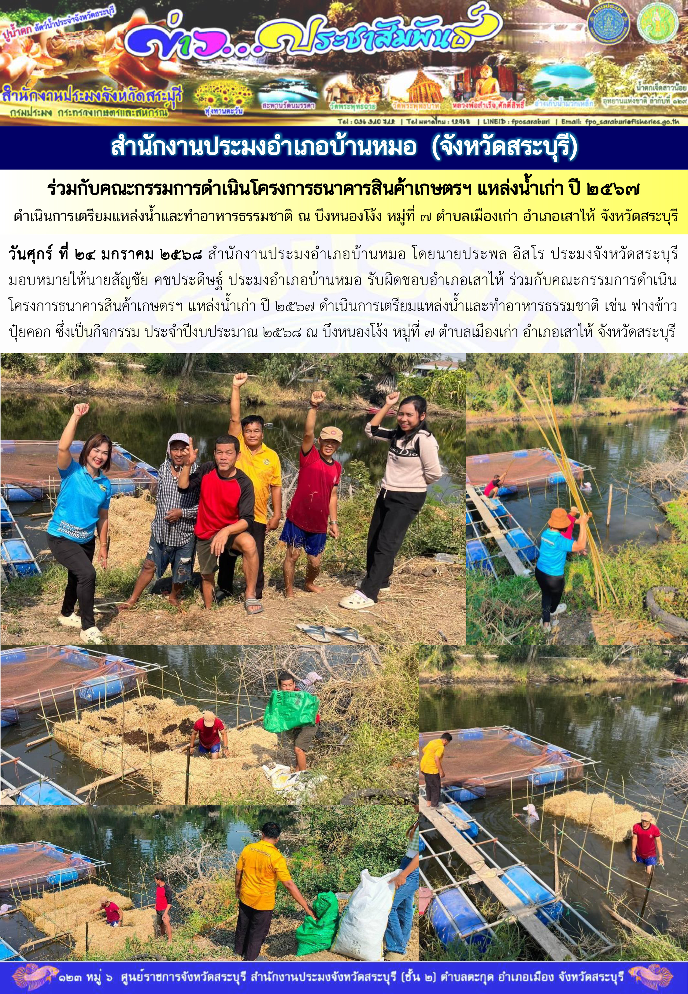 วันศุกร์ ที่ 24 มกราคม 2568 สำนักงานประมงอำเภอบ้านหมอ โดยนายประพล อิสโร ประมงจังหวัดสระบุรี มอบหมายให้นายสัญชัย คชประดิษฐ์ ประมงอำเภอบ้านหมอ รับผิดชอบอำเภอเสาไห้ ร่วมกับคณะกรรมการดำเนินโครงการธนาคารสินค้าเกษตรฯ แหล่งน้ำเก่า ปี 2567 ดำเนินการเตรียมแหล่งน้ำและทำอาหารธรรมชาติ เช่น ฟางข้าว ปุ๋ยคอก ซึ่งเป็นกิจกรรม ประจำปีงบประมาณ 2568 ณ บึงหนองโง้ง หมู่ที่ 7 ตำบลเมืองเก่า อำเภอเสาไห้ จังหวัดสระบุรี