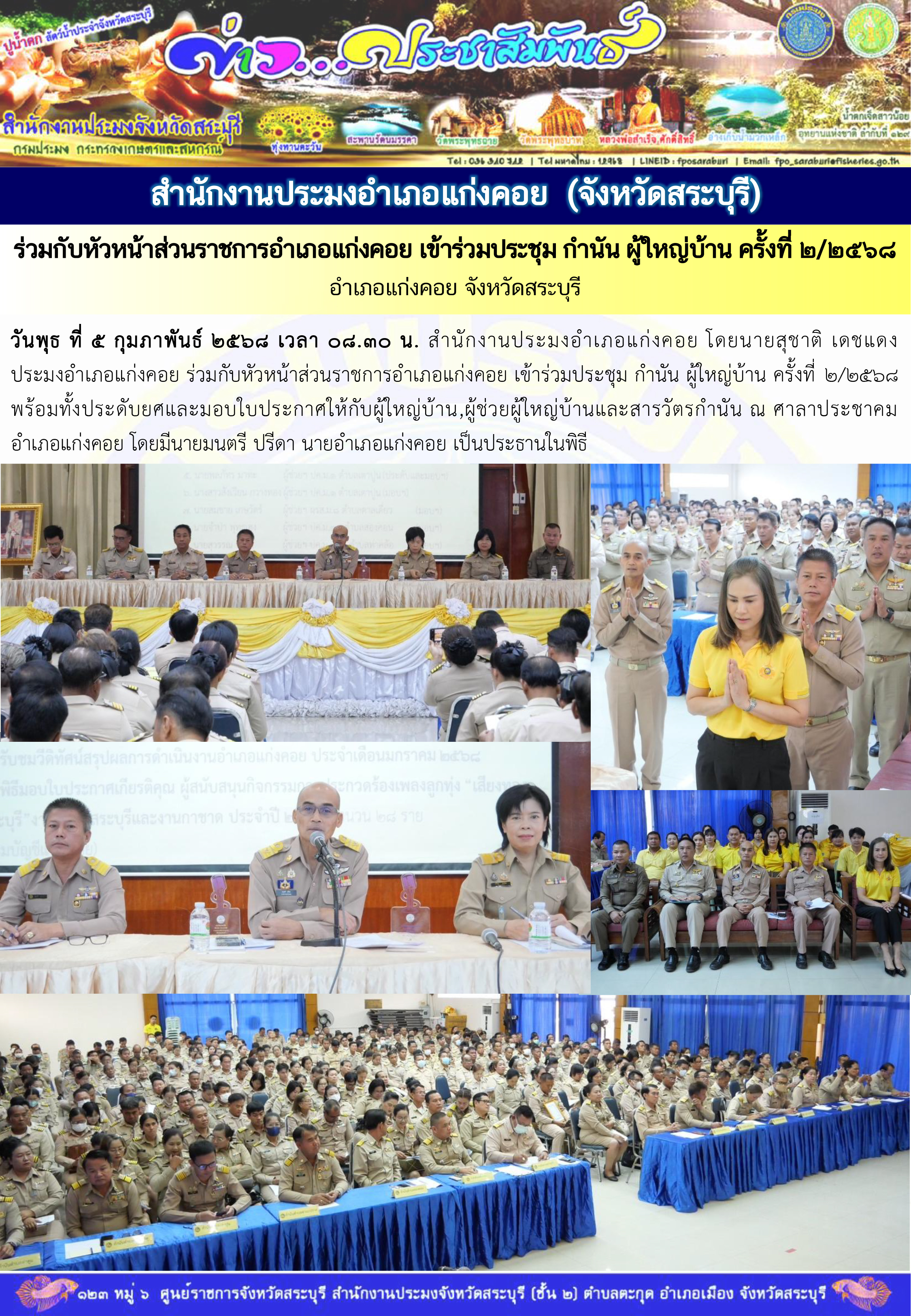 สำนักงานประมงอำเภอแก่งคอย ร่วมกับหัวหน้าส่วนราชการอำเภอแก่งคอย เข้าร่วมประชุม กำนัน ผู้ใหญ่บ้าน ครั้งที่ 2/2568 อำเภอแก่งคอย จังหวัดสระบุรี