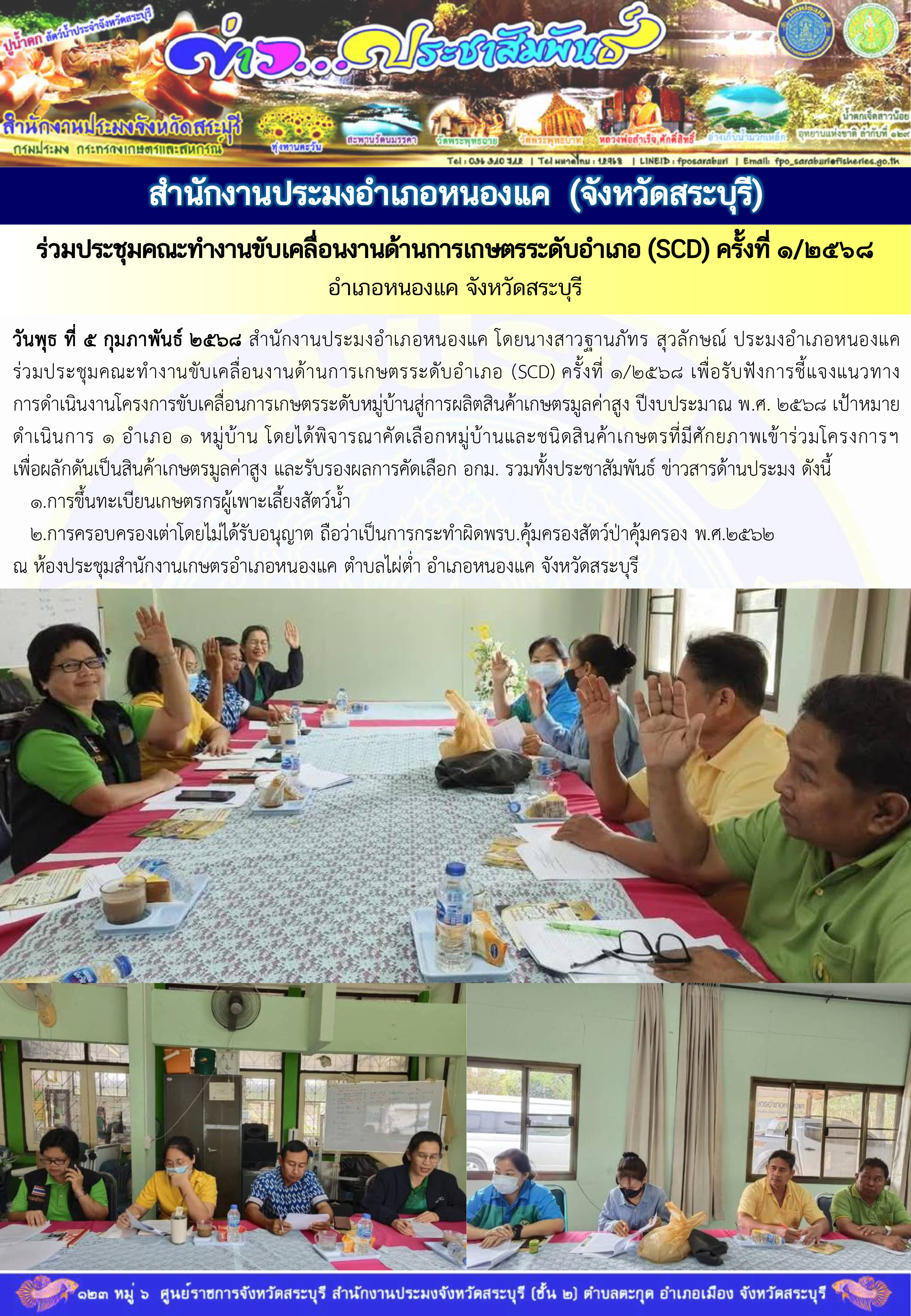 วันพุธ ที่ 5 กุมภาพันธ์ 2568 สำนักงานประมงอำเภอหนองแค โดยนางสาวฐานภัทร สุวลักษณ์ ประมงอำเภอหนองแค ร่วมประชุมคณะทำงานขับเคลื่อนงานด้านการเกษตรระดับอำเภอ (SCD) ครั้งที่ 1/2568 เพื่อรับฟังการชี้แจงแนวทางการดำเนินงานโครงการขับเคลื่อนการเกษตรระดับหมู่บ้านสู่การผลิตสินค้าเกษตรมูลค่าสูง ปีงบประมาณ พ.ศ. 2568 เป้าหมายดำเนินการ 1 อำเภอ 1 หมู่บ้าน โดยได้พิจารณาคัดเลือกหมู่บ้านและชนิดสินค้าเกษตรที่มีศักยภาพเข้าร่วมโครงการฯ เพื่อผลักดันเป็นสินค้าเกษตรมูลค่าสูง และรับรองผลการคัดเลือก อกม. รวมทั้งประชาสัมพันธ์ ข่าวสารด้านประมงดังนี้