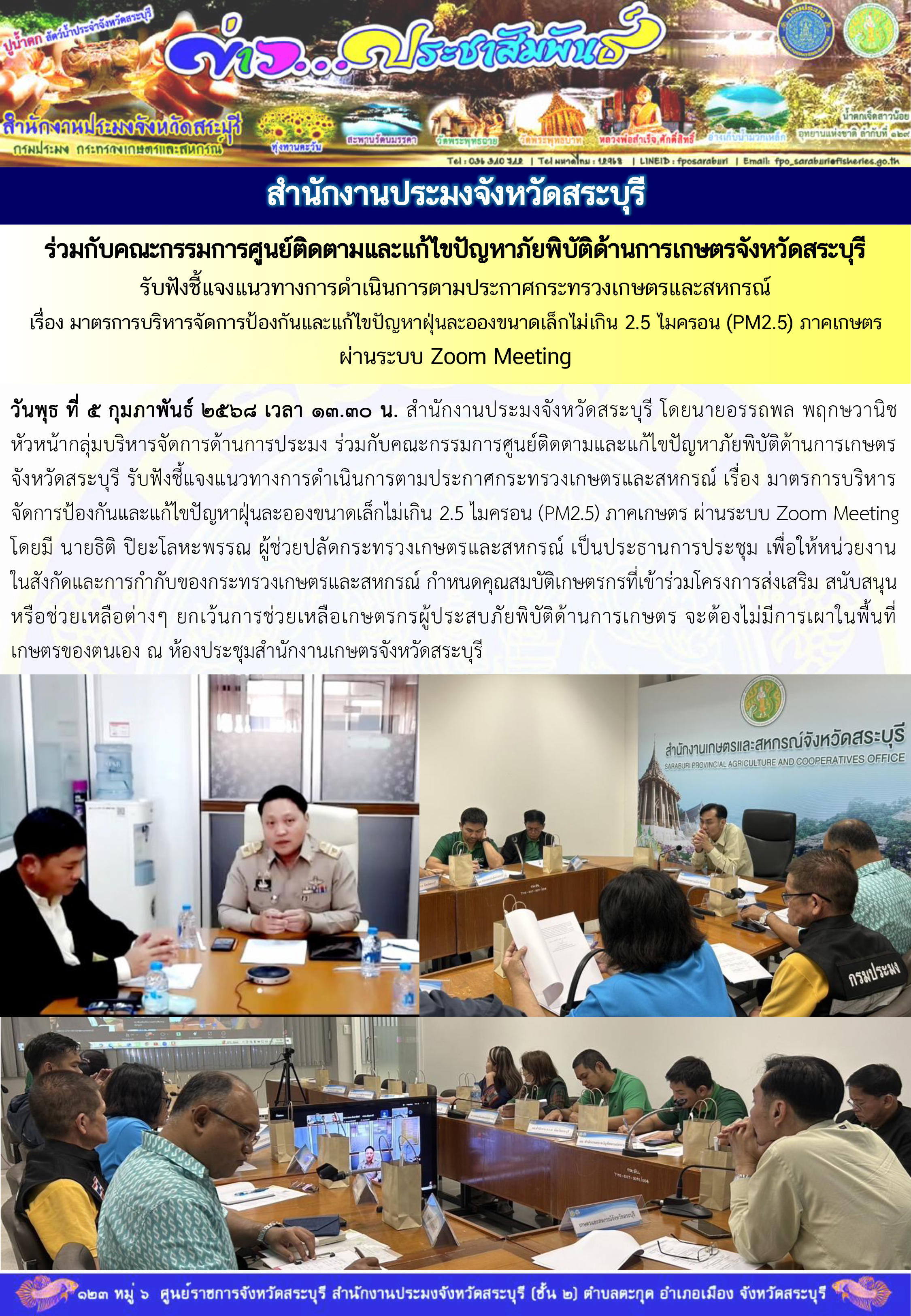 วันพุธ ที่ 5 กุมภาพันธ์ 2568 สำนักงานประมงจังหวัดสระบุรี โดยนายอรรถพล พฤกษวานิช หัวหน้ากลุ่มบริหารจัดการด้านการประมง ร่วมกับคณะกรรมการศูนย์ติดตามและแก้ไขปัญหาภัยพิบัติด้านการเกษตรจังหวัดสระบุรี รับฟังชี้แจงแนวทางการดำเนินการตามประกาศกระทรวงเกษตรและสหกรณ์ เรื่อง มาตรการบริหารจัดการป้องกันและแก้ไขปัญหาฝุ่นละอองขนาดเล็กไม่เกิน 2.5 ไมครอน (PM2.5) ภาคเกษตร ผ่านระบบ Zoom Meeting  โดยมี นายธิติ ปิยะโลหะพรรณ ผู้ช่วยปลัดกระทรวงเกษตรและสหกรณ์ เป็นประธานการประชุม เพื่อให้หน่วยงานในสังกัดและการกำกับของกระทรวงเกษตรและสหกรณ์ กำหนดคุณสมบัติเกษตรกรที่เข้าร่วมโครงการส่งเสริม สนับสนุน หรือช่วยเหลือต่างๆ ยกเว้นการช่วยเหลือเกษตรกรผู้ประสบภัยพิบัติด้านการเกษตร จะต้องไม่มีการเผาในพื้นที่เกษตรของตนเอง ณ ห้องประชุมสำนักงานเกษตรจังหวัดสระบุรี
