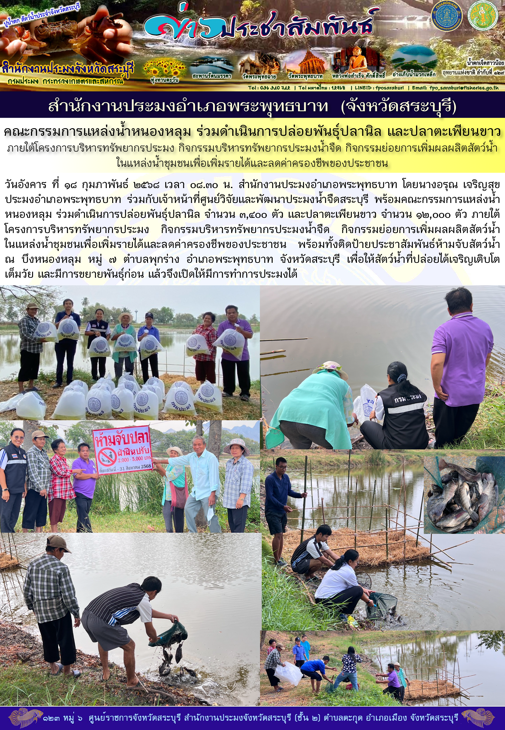 วันอังคาร ที่ ๑๘ กุมภาพันธ์ ๒๕๖๘ เวลา ๐๘.๓๐ น. สำนักงานประมงอำเภอพระพุทธบาท โดยนางอรุณ เจริญสุข ประมงอำเภอพระพุทธบาท ร่วมกับเจ้าหน้าที่ศูนย์วิจัยและพัฒนาประมงน้ำจืดสระบุรี พร้อมคณะกรรมการแหล่งน้ำหนองหลุม ร่วมดำเนินการปล่อยพันธุ์ปลานิล จำนวน ๓,๔๐๐ ตัว และปลาตะเพียนขาว จำนวน ๑๒,๐๐๐ ตัว ภายใต้โครงการบริหารทรัพยากรประมง กิจกรรมบริหารทรัพยากรประมงน้ำจืด กิจกรรมย่อยการเพิ่มผลผลิตสัตว์น้ำในแหล่งน้ำชุมชนเพื่อเพิ่มรายได้และลดค่าครองชีพของประชาชน พร้อมทั้งติดป้ายประชาสัมพันธ์ห้ามจับสัตว์น้ำ  ณ บึงหนองหลุม หมู่ ๗ ตำบลพุกร่าง อำเภอพระพุทธบาท จังหวัดสระบุรี เพื่อให้สัตว์น้ำที่ปล่อยได้เจริญเติบโต เต็มวัย และมีการขยายพันธุ์ก่อน แล้วจึงเปิดให้มีการทำการประมงได้