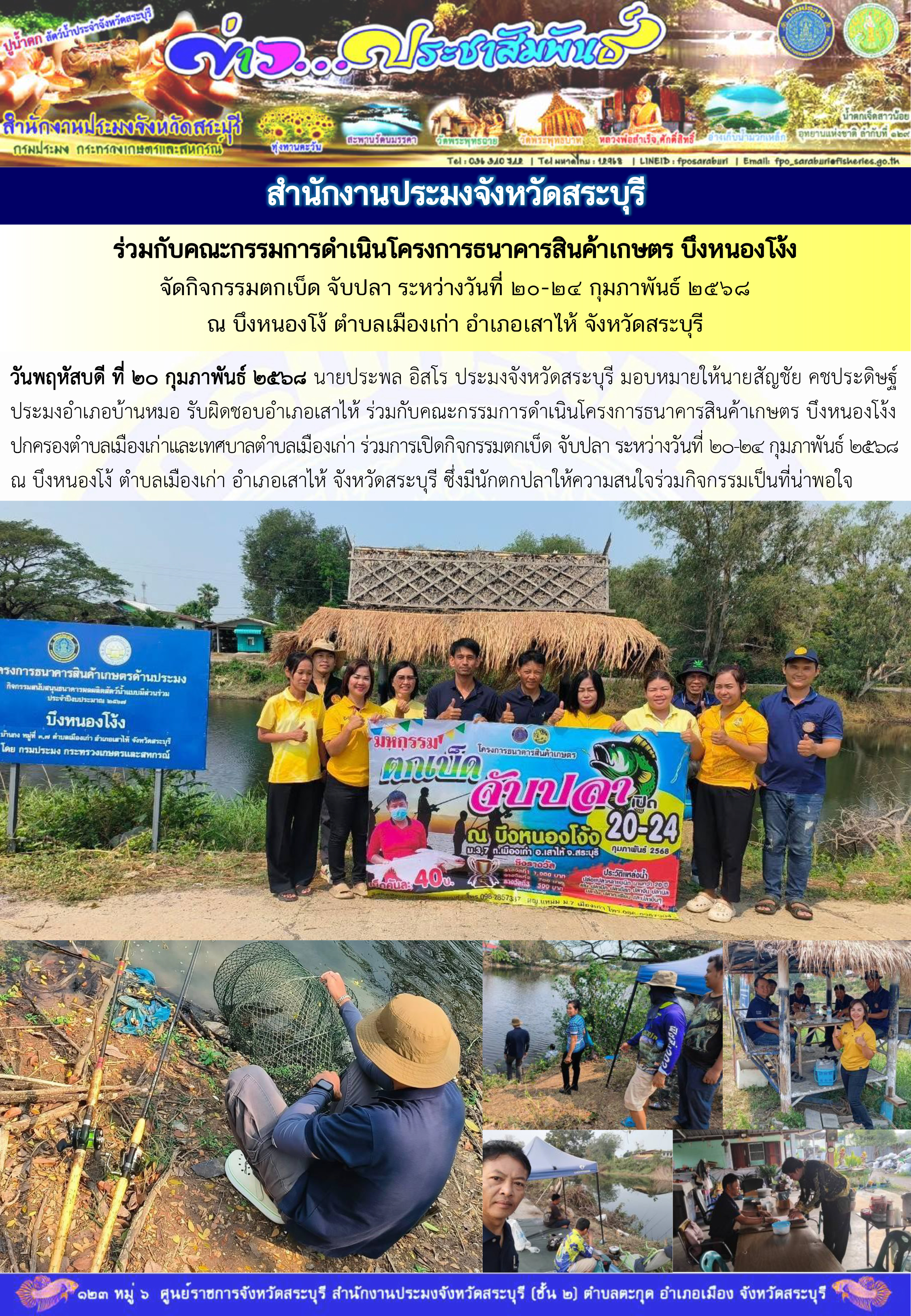 วันพฤหัสบดี ที่ 20 กุมภาพันธ์ 2568 นายประพล อิสโร ประมงจังหวัดสระบุรี มอบหมายให้นายสัญชัย คชประดิษฐ์ ประมงอำเภอบ้านหมอ รับผิดชอบอำเภอเสาไห้ ร่วมกับคณะกรรมการดำเนินโครงการธนาคารสินค้าเกษตร บึงหนองโง้ง ปกครองตำบลเมืองเก่าและเทศบาลตำบลเมืองเก่า ร่วมการเปิดกิจกรรมตกเบ็ด จับปลา ระหว่างวันที่ 20-24 กุมภาพันธ์ 2568 ณ บึงหนองโง้ ตำบลเมืองเก่า อำเภอเสาไห้ จังหวัดสระบุรี ซึ่งมีนักตกปลาให้ความสนใจร่วมกิจกรรมเป็นที่น่าพอใจ