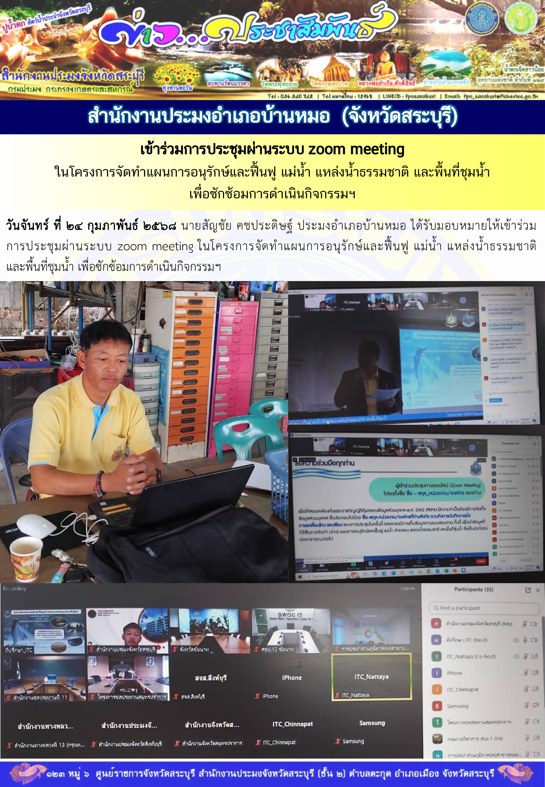 วันจันทร์ ที่ 24 กุมภาพันธ์ 2568 นายสัญชัย คชประดิษฐ์ ประมงอำเภอบ้านหมอ ได้รับมอบหมายให้เข้าร่วมการประชุมผ่านระบบ zoom meeting ในโครงการจัดทำแผนการอนุรักษ์และฟื้นฟู แม่น้ำ แหล่งน้ำธรรมชาติ และพื้นที่ชุมน้ำ เพื่อซักซ้อมการดำเนินกิจกรรมฯ