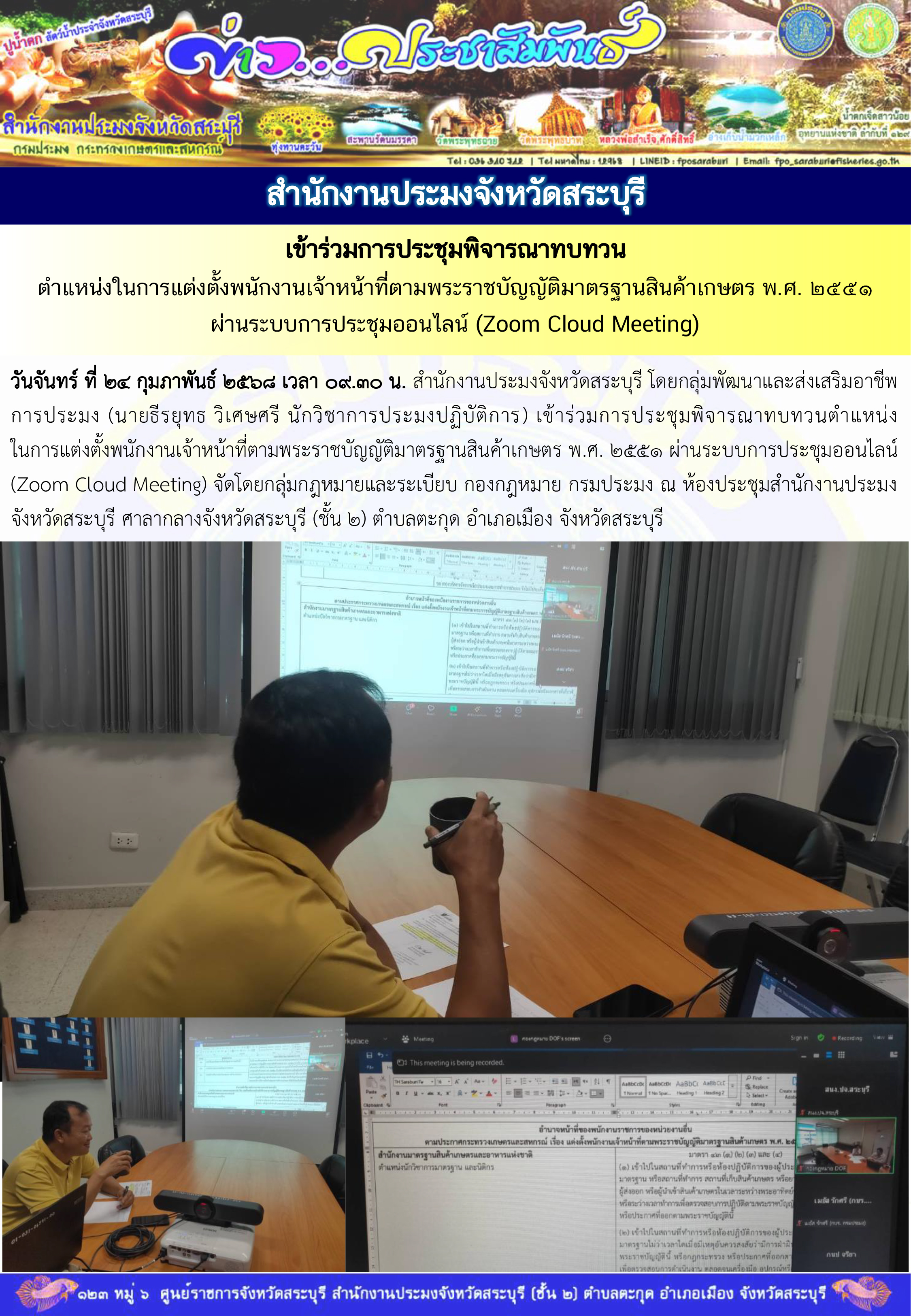 สำนักงานประมงจังหวัดสระบุรี เข้าร่วมการประชุมพิจารณาทบทวนตำแหน่งในการแต่งตั้งพนักงานเจ้าหน้าที่ตามพระราชบัญญัติมาตรฐานสินค้าเกษตร พ.ศ. 2551 ผ่านระบบการประชุมออนไลน์ (Zoom Cloud Meeting)