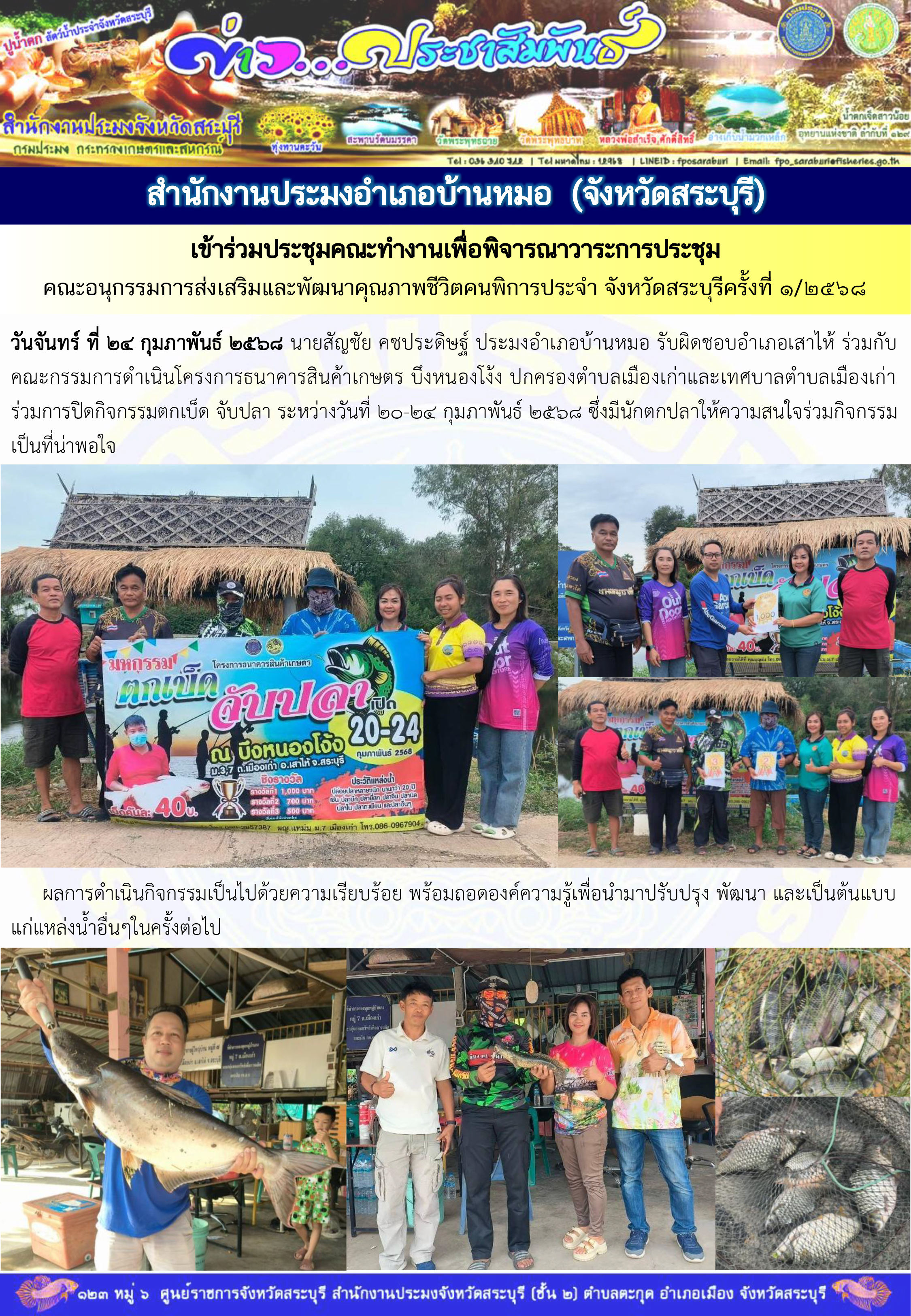 สำนักงานประมงอำเภอบ้านหมอ ร่วมกับคณะกรรมการดำเนินโครงการธนาคารสินค้าเกษตร บึงหนองโง้ง ปกครองตำบลเมืองเก่าและเทศบาลตำบลเมืองเก่า ร่วมการปิดกิจกรรมตกเบ็ด จับปลา ระหว่างวันที่ 20-24 กุมภาพันธ์ 2568