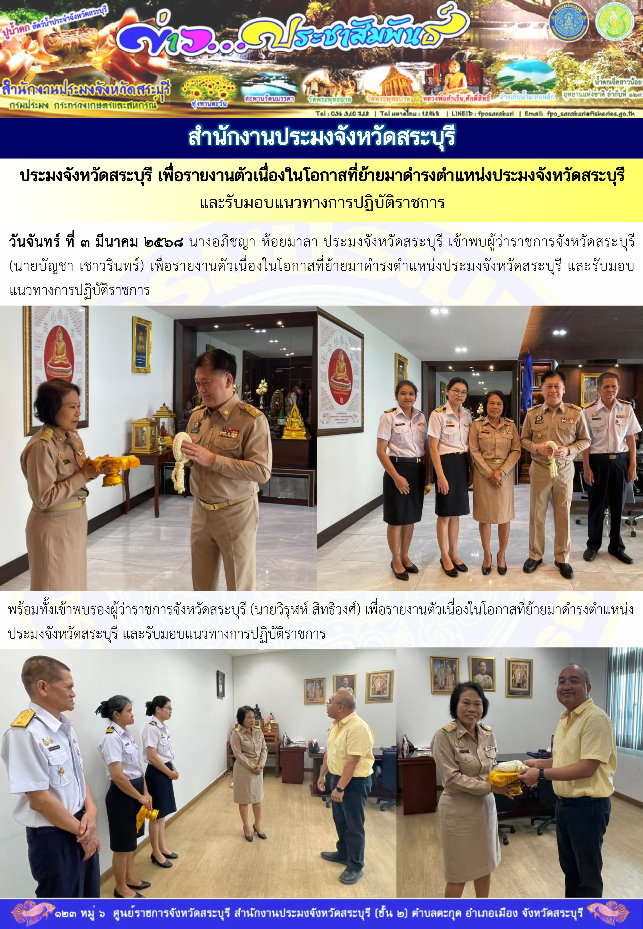 วันจันทร์ ที่ 3 มีนาคม 2568 นางอภิชญา ห้อยมาลา ประมงจังหวัดสระบุรี เข้าพบผู้ว่าราชการจังหวัดสระบุรี (นายบัญชา เชาวรินทร์) เพื่อรายงานตัวเนื่องในโอกาสที่ย้ายมาดำรงตำแหน่งประมงจังหวัดสระบุรี และรับมอบแนวทางการปฏิบัติราชการ