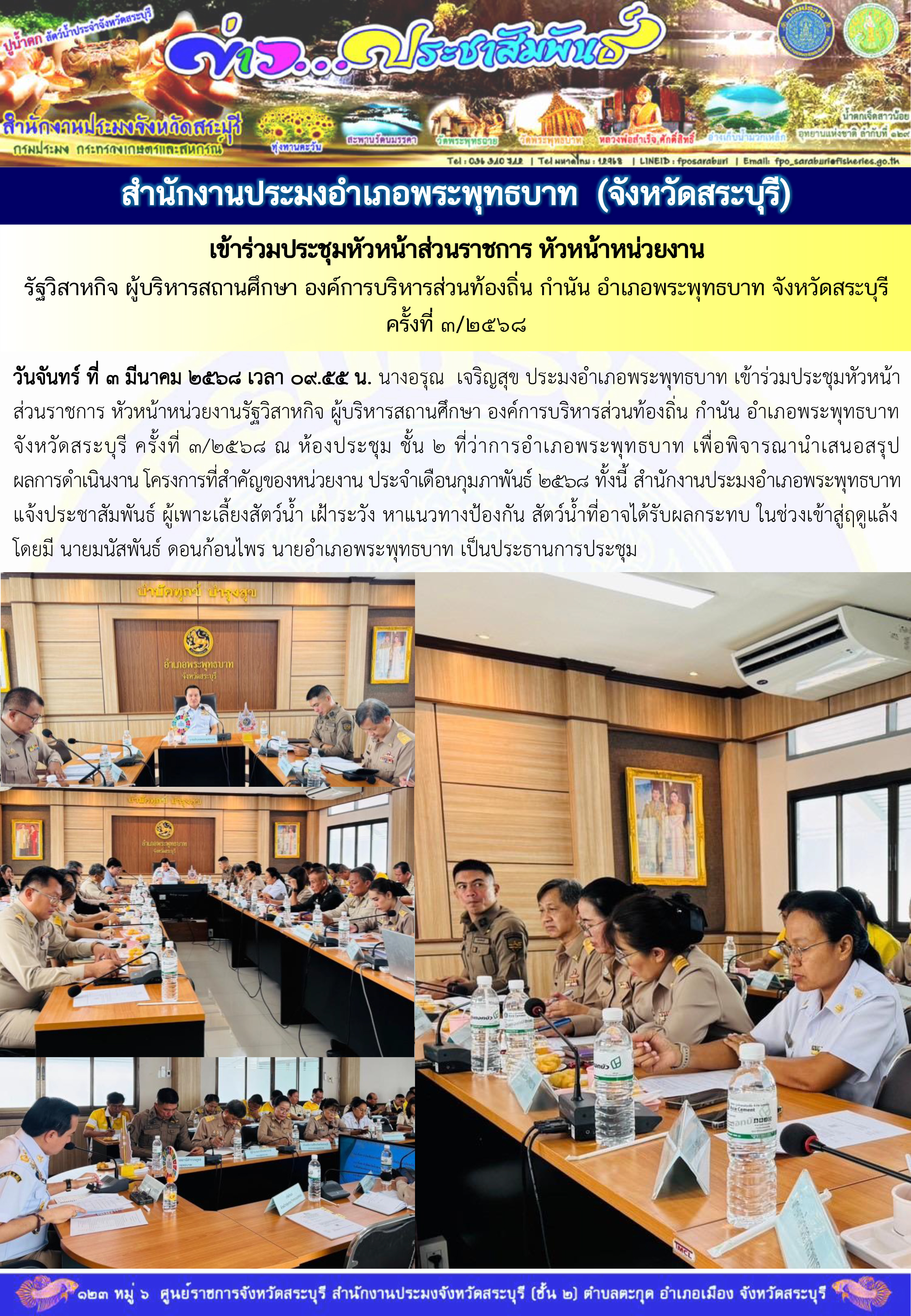 วันจันทร์ ที่ 3 มีนาคม 2568 เวลา 09.55 น. นางอรุณ เจริญสุข ประมงอำเภอพระพุทธบาท เข้าร่วมประชุมหัวหน้าส่วนราชการ หัวหน้าหน่วยงานรัฐวิสาหกิจ ผู้บริหารสถานศึกษา องค์การบริหารส่วนท้องถิ่น กำนัน อำเภอพระพุทธบาท จังหวัดสระบุรี ครั้งที่ 3/2568 ณ ห้องประชุม ชั้น 2 ที่ว่าการอำเภอพระพุทธบาท เพื่อพิจารณานำเสนอสรุปผลการดำเนินงาน โครงการที่สำคัญของหน่วยงาน ประจำเดือนกุมภาพันธ์ 2568 ทั้งนี้ สำนักงานประมงอำเภอพระพุทธบาท แจ้งประชาสัมพันธ์ ผู้เพาะเลี้ยงสัตว์น้ำ เฝ้าระวัง หาแนวทางป้องกัน สัตว์น้ำที่อาจได้รับผลกระทบ ในช่วงเข้าสู่ฤดูแล้ง โดยมี นายมนัสพันธ์ ดอนก้อนไพร นายอำเภอพระพุทธบาท เป็นประธานการประชุม