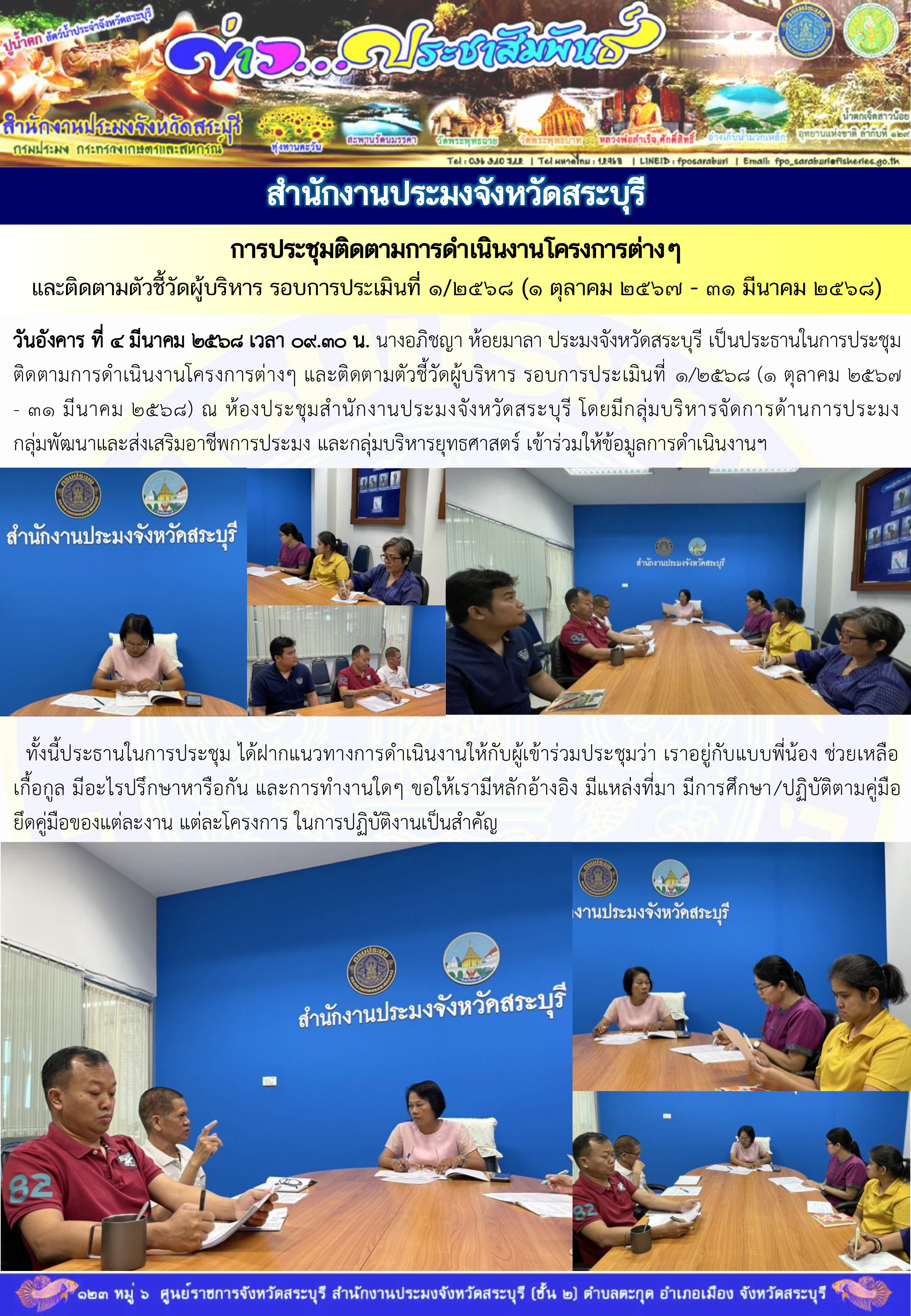 สำนักงานประมงจังหวัดสระบุรี การประชุมติดตามการดำเนินงานโครงการต่างๆ และติดตามตัวชี้วัดผู้บริหาร รอบการประเมินที่ 1/2568 (1 ตุลาคม 2567 - 31 มีนาคม 2568)