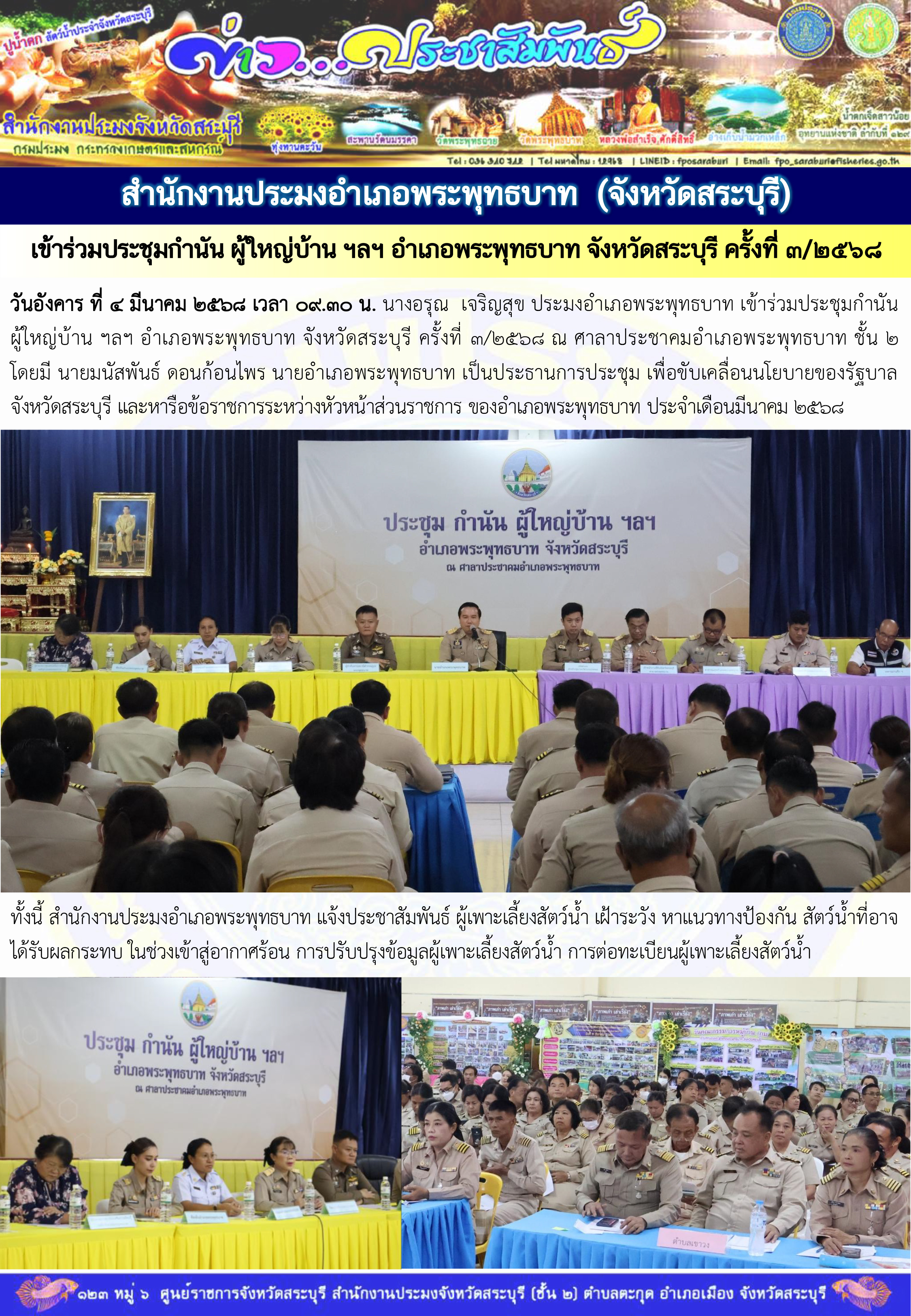 วันอังคาร ที่ 4 มีนาคม 2568 เวลา 09.30 น. นางอรุณ  เจริญสุข ประมงอำเภอพระพุทธบาท เข้าร่วมประชุมกำนัน ผู้ใหญ่บ้าน ฯลฯ อำเภอพระพุทธบาท จังหวัดสระบุรี ครั้งที่ 3/2568 ณ ศาลาประชาคมอำเภอพระพุทธบาท ชั้น 2 โดยมี นายมนัสพันธ์ ดอนก้อนไพร นายอำเภอพระพุทธบาท เป็นประธานการประชุม เพื่อขับเคลื่อนนโยบายของรัฐบาล จังหวัดสระบุรี และหารือข้อราชการระหว่างหัวหน้าส่วนราชการ ของอำเภอพระพุทธบาท ประจำเดือนมีนาคม 2568 ทั้งนี้ สำนักงานประมงอำเภอพระพุทธบาท แจ้งประชาสัมพันธ์ ผู้เพาะเลี้ยงสัตว์น้ำ เฝ้าระวัง หาแนวทางป้องกัน สัตว์น้ำที่อาจได้รับผลกระทบ ในช่วงเข้าสู่อากาศร้อน การปรับปรุงข้อมูลผู้เพาะเลี้ยงสัตว์น้ำ การต่อทะเบียนผู้เพาะเลี้ยงสัตว์น้ำ