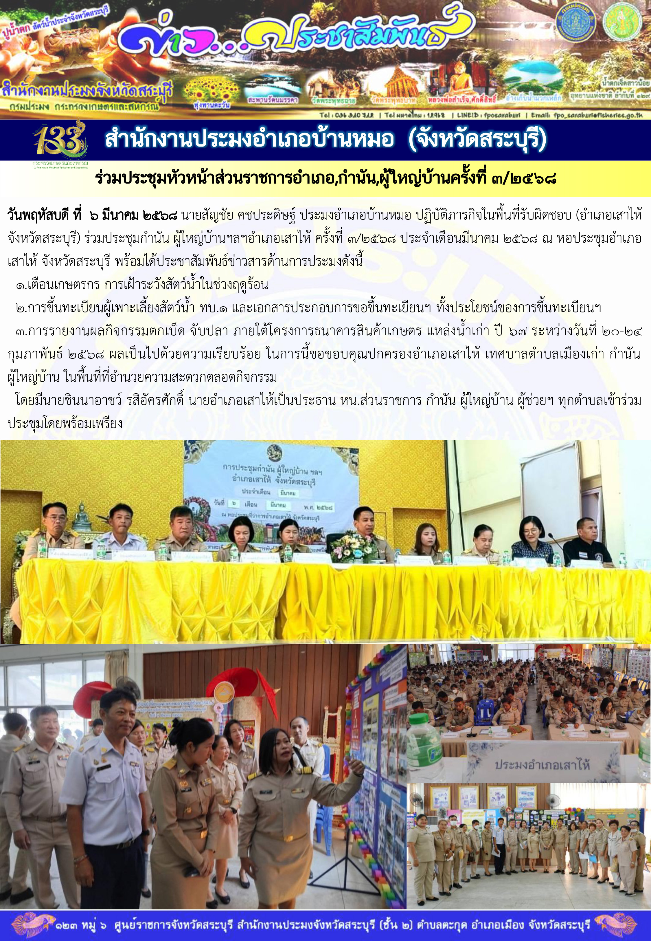 วันพฤหัสบดี ที่  6 มีนาคม 2568 นายสัญชัย คชประดิษฐ์ ประมงอำเภอบ้านหมอ ปฏิบัติภารกิจในพื้นที่รับผิดชอบ (อำเภอเสาไห้ จังหวัดสระบุรี) ร่วมประชุมกำนัน ผู้ใหญ่บ้านฯลฯอำเภอเสาไห้ ครั้งที่ 3/2568 ประจำเดือนมีนาคม 2568 ณ หอประชุมอำเภอเสาไห้ จังหวัดสระบุรี พร้อมได้ประชาสัมพันธ์ข่าวสารด้านการประมงดังนี้