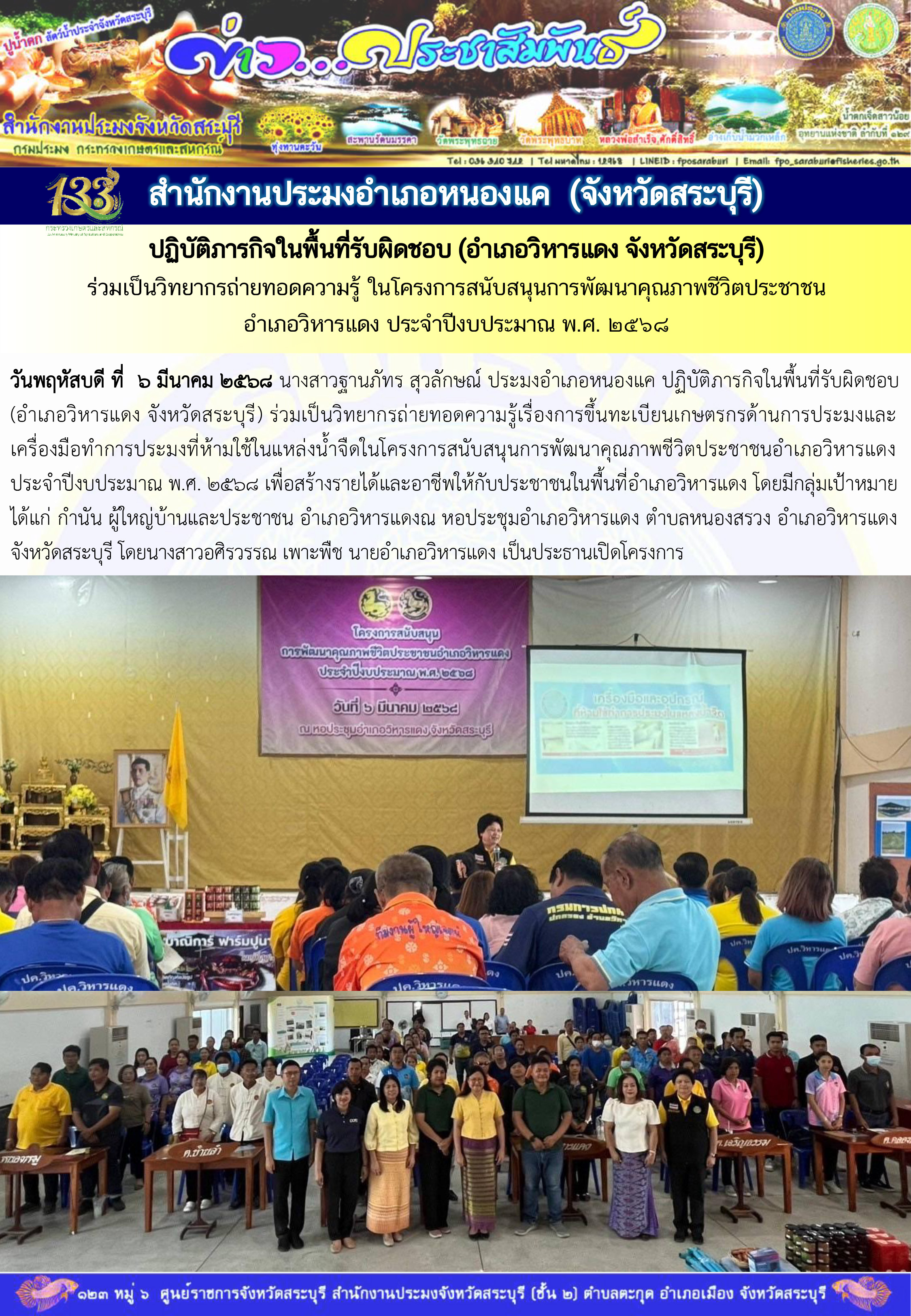 ภารกิจประจำวันที่ 6 มีนาคม 2568 สำนักงานประมงจังหวัดสระบุรี..คลิก
