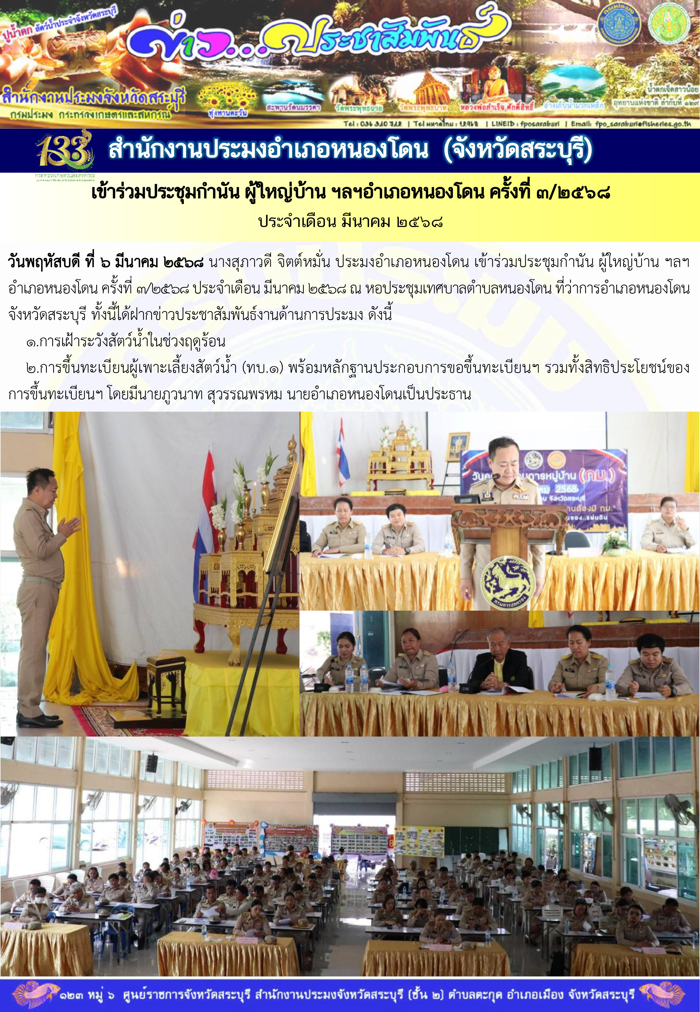 วันพฤหัสบดี ที่ 6 มีนาคม 2568 นางสุภาวดี จิตต์หมั่น ประมงอำเภอหนองโดน เข้าร่วมประชุมกำนัน ผู้ใหญ่บ้าน ฯลฯอำเภอหนองโดน ครั้งที่ 3/2568 ประจำเดือน มีนาคม 2568 ณ หอประชุมเทศบาลตำบลหนองโดน ที่ว่าการอำเภอหนองโดน จังหวัดสระบุรี ทั้งนี้ได้ฝากข่าวประชาสัมพันธ์งานด้านการประมง ดังนี้