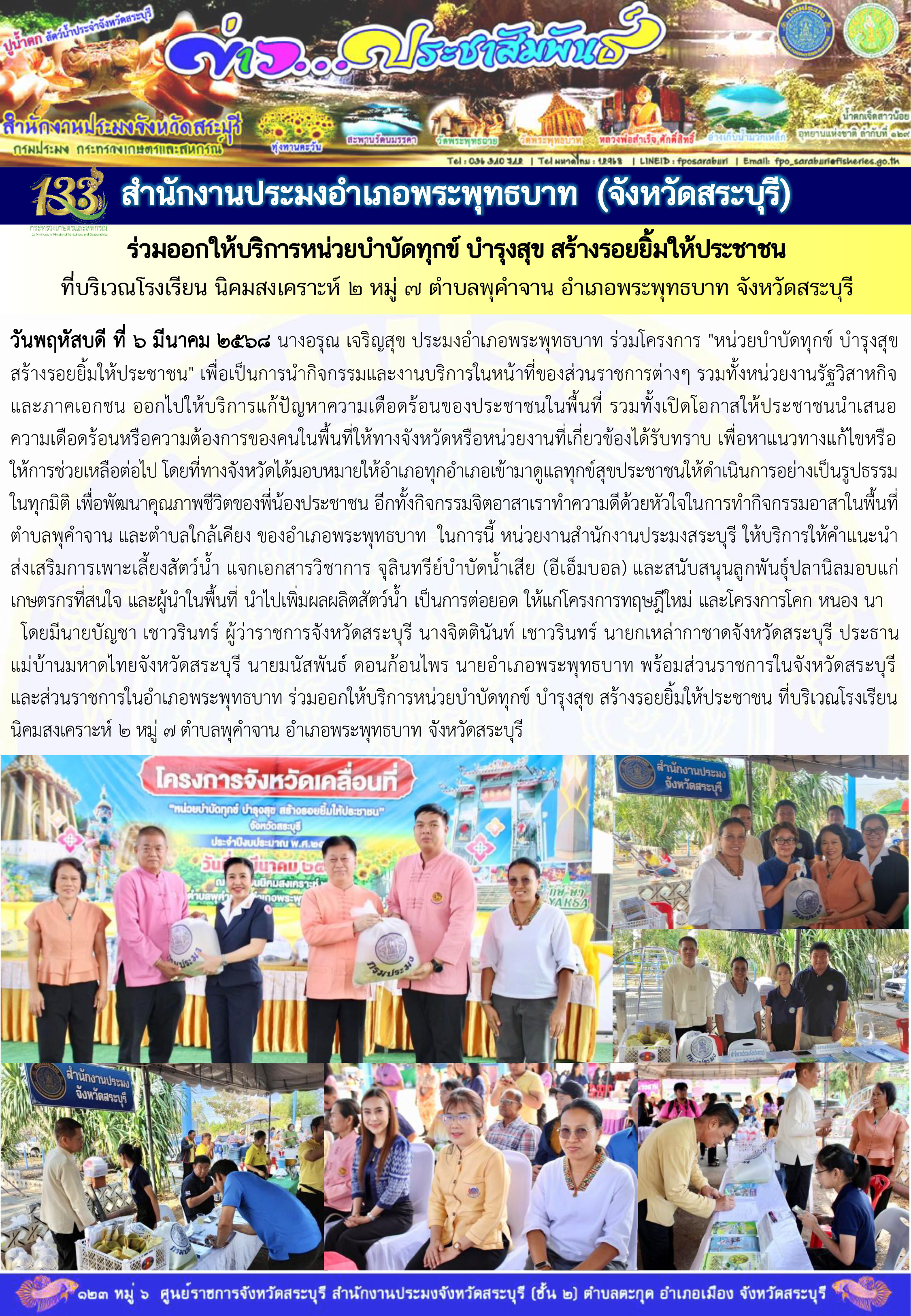 สำนักงานประมงอำเภอพระพุทธบาท ร่วมออกให้บริการหน่วยบำบัดทุกข์ บำรุงสุข สร้างรอยยิ้มให้ประชาชน ที่บริเวณโรงเรียน นิคมสงเคราะห์ 2 หมู่ 7 ตำบลพุคำจาน อำเภอพระพุทธบาท จังหวัดสระบุรี