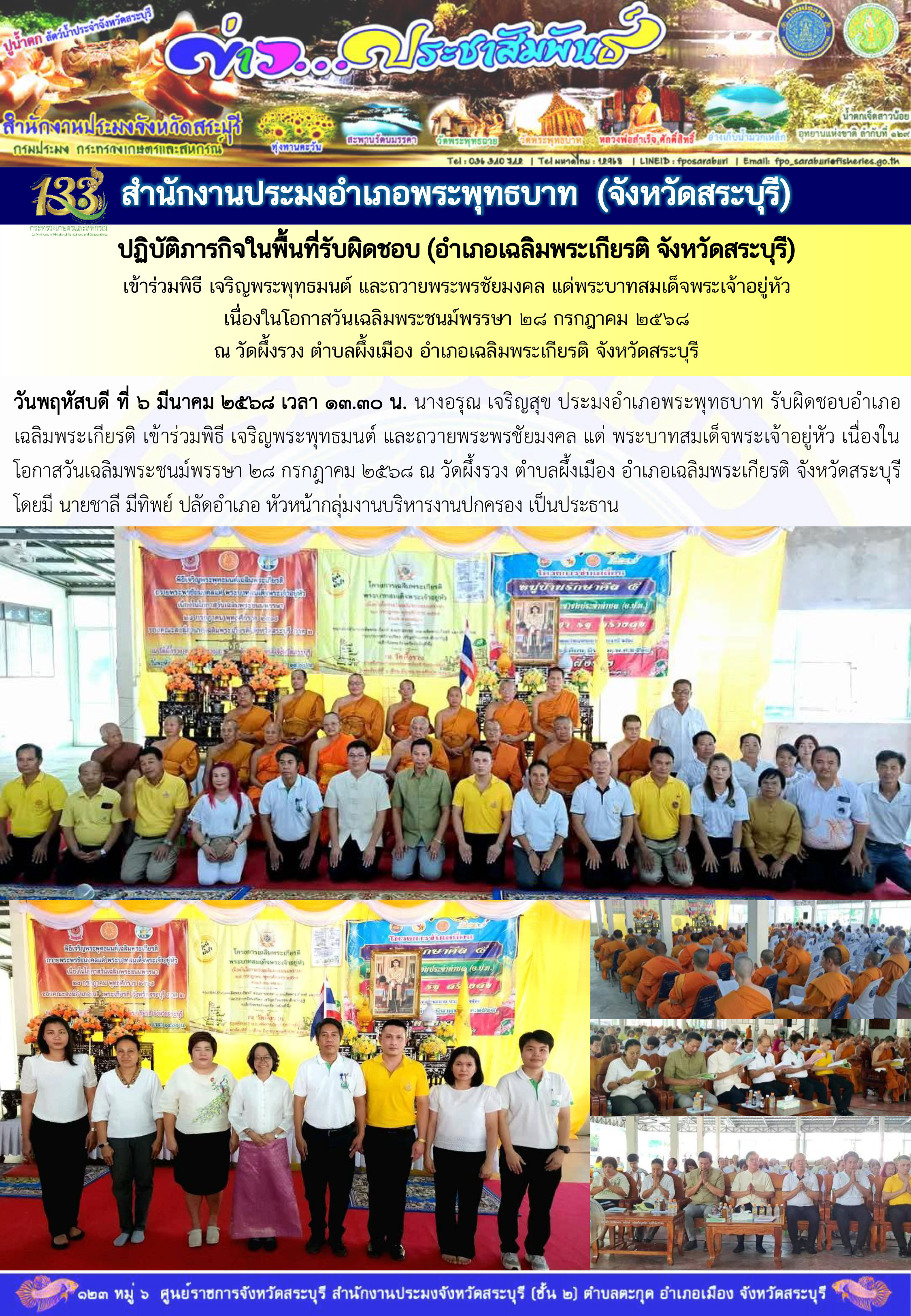 สำนักงานประมงอำเภอพระพุทธบาท ปฏิบัติภารกิจในพื้นที่รับผิดชอบ (อำเภอเฉลิมพระเกียรติ จังหวัดสระบุรี)เข้าร่วมพิธี เจริญพระพุทธมนต์ และถวายพระพรชัยมงคล แด่พระบาทสมเด็จพระเจ้าอยู่หัว เนื่องในโอกาสวันเฉลิมพระชนม์พรรษา 28 กรกฎาคม 2568 ณ วัดผึ้งรวง ตำบลผึ้งเมือง อำเภอเฉลิมพระเกียรติ จังหวัดสระบุรี