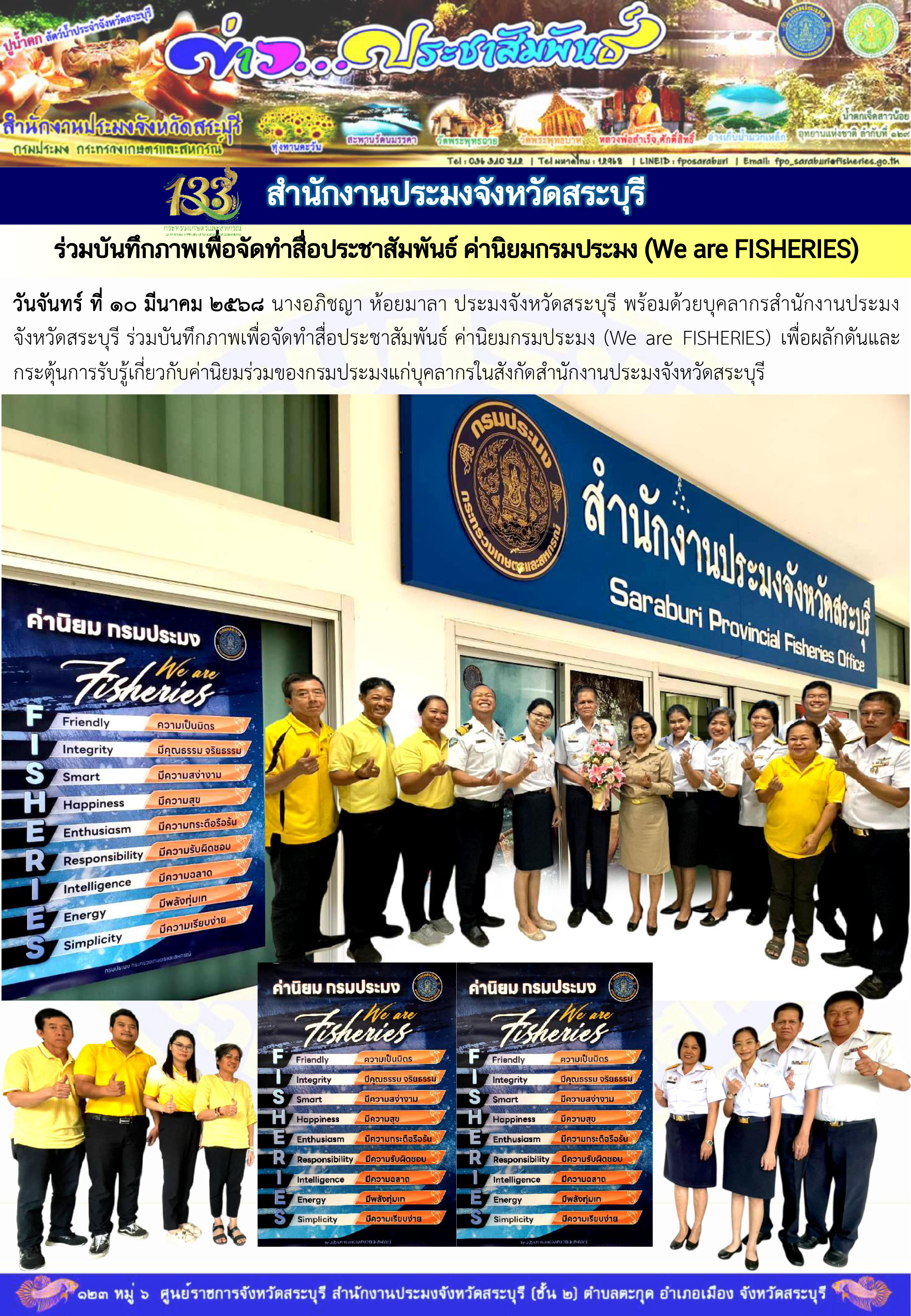 วันจันทร์ ที่ 10 มีนาคม 2568 นางอภิชญา ห้อยมาลา ประมงจังหวัดสระบุรี พร้อมด้วยบุคลากรสำนักงานประมงจังหวัดสระบุรี ร่วมบันทึกภาพเพื่อจัดทำสื่อประชาสัมพันธ์ ค่านิยมกรมประมง (We are FISHERIES) เพื่อผลักดันและกระตุ้นการรับรู้เกี่ยวกับค่านิยมร่วมของกรมประมงแก่บุคลากรในสังกัดสำนักงานประมงจังหวัดสระบุรี