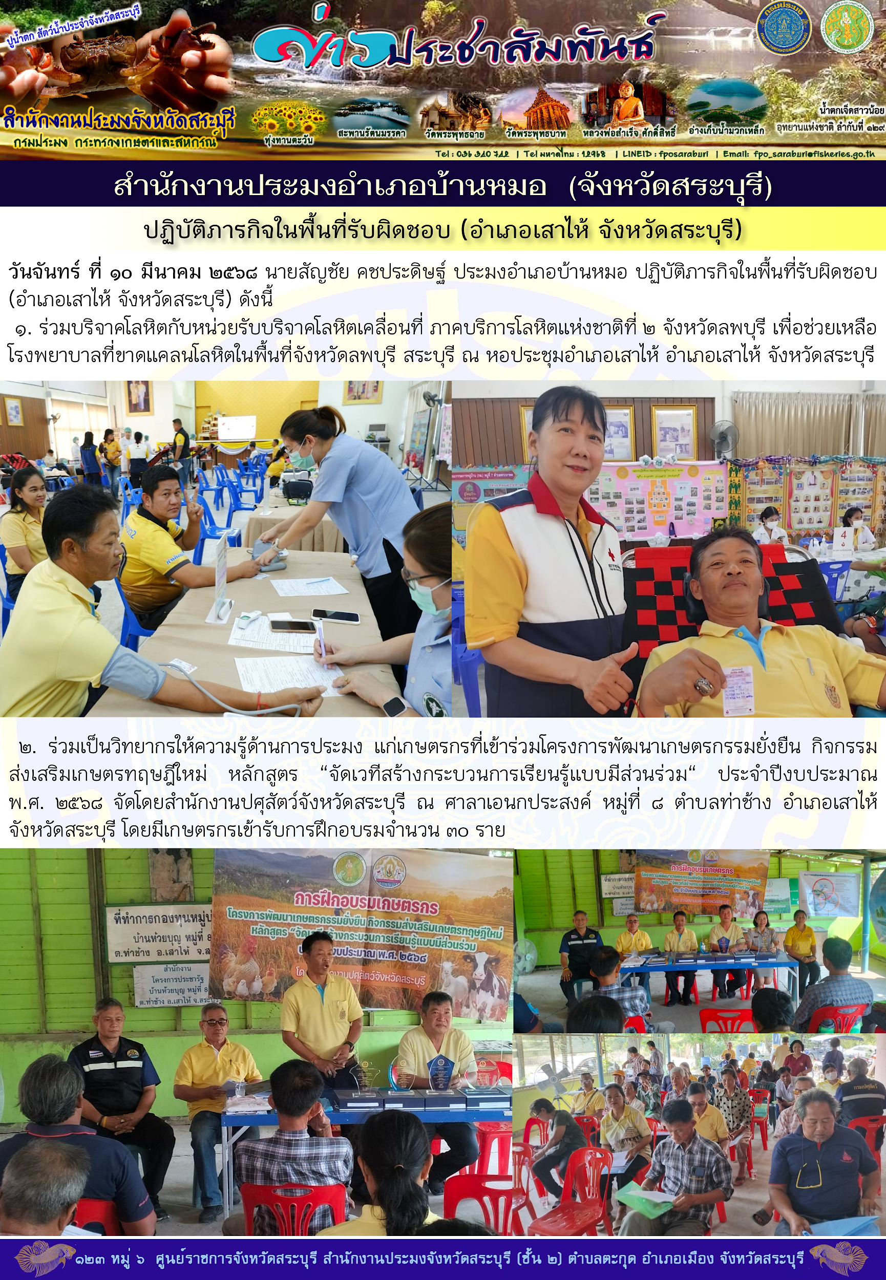 วันจันทร์ ที่ ๑๐ มีนาคม ๒๕๖๘ นายสัญชัย คชประดิษฐ์ ประมงอำเภอบ้านหมอ ปฏิบัติภารกิจในพื้นที่รับผิดชอบ (อำเภอเสาไห้ จังหวัดสระบุรี) ดังนี้