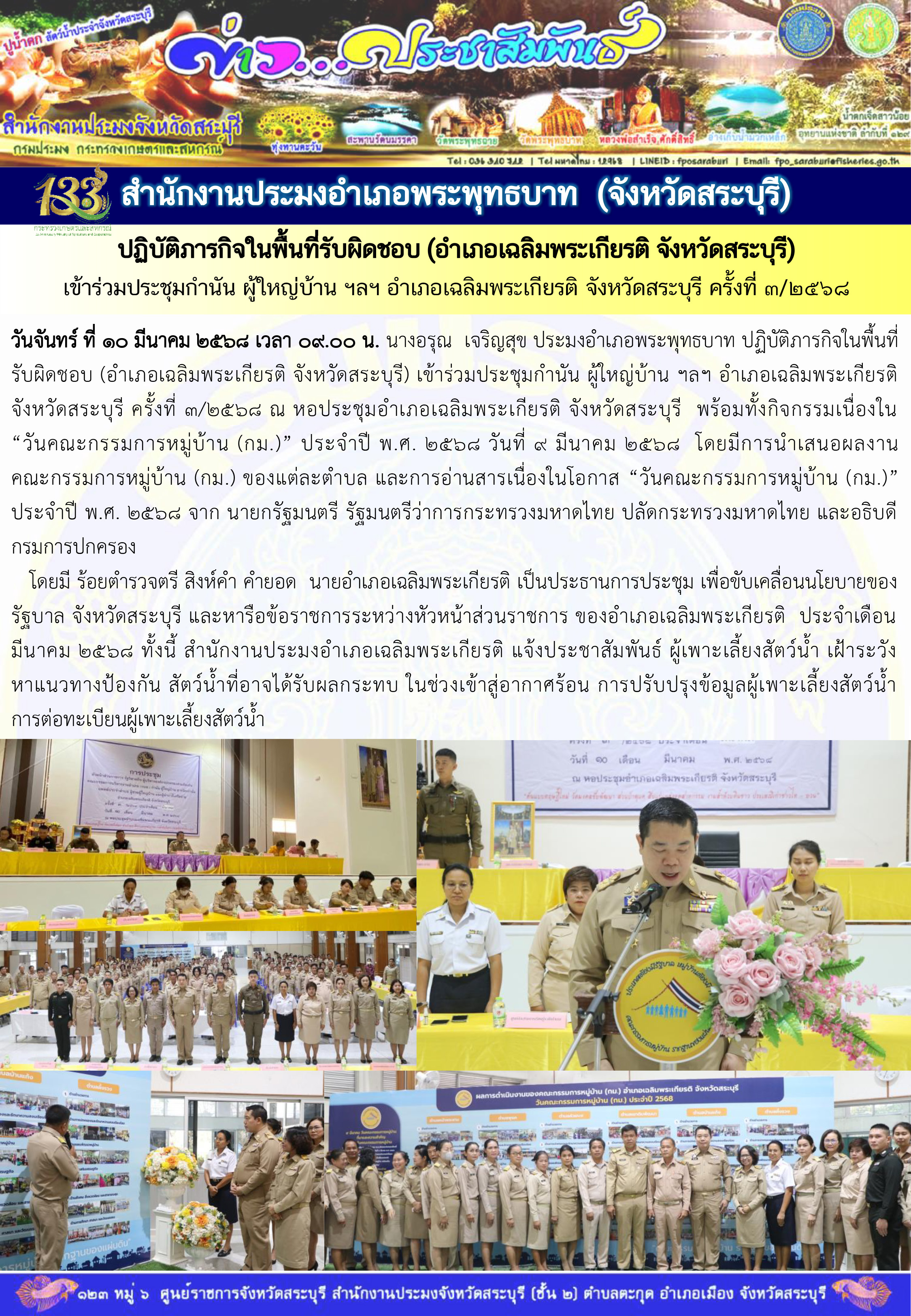 วันจันทร์ ที่ 10 มีนาคม 2568 เวลา 09.00 น. นางอรุณ  เจริญสุข ประมงอำเภอพระพุทธบาท ปฏิบัติภารกิจในพื้นที่รับผิดชอบ (อำเภอเฉลิมพระเกียรติ จังหวัดสระบุรี) เข้าร่วมประชุมกำนัน ผู้ใหญ่บ้าน ฯลฯ อำเภอเฉลิมพระเกียรติ จังหวัดสระบุรี ครั้งที่ 3/2568 ณ หอประชุมอำเภอเฉลิมพระเกียรติ จังหวัดสระบุรี  พร้อมทั้งกิจกรรมเนื่องใน “วันคณะกรรมการหมู่บ้าน (กม.)” ประจำปี พ.ศ. 2568 วันที่ 9 มีนาคม 2568  โดยมีการนำเสนอผลงานคณะกรรมการหมู่บ้าน (กม.) ของแต่ละตำบล และการอ่านสารเนื่องในโอกาส “วันคณะกรรมการหมู่บ้าน (กม.)” ประจำปี พ.ศ. 2568 จาก นายกรัฐมนตรี รัฐมนตรีว่าการกระทรวงมหาดไทย ปลัดกระทรวงมหาดไทย และอธิบดีกรมการปกครอง